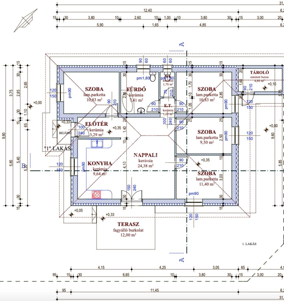 MÉRETEK, TÁJOLÁS, ELRENDEZÉS, AZ ALAPRAJZOKON.