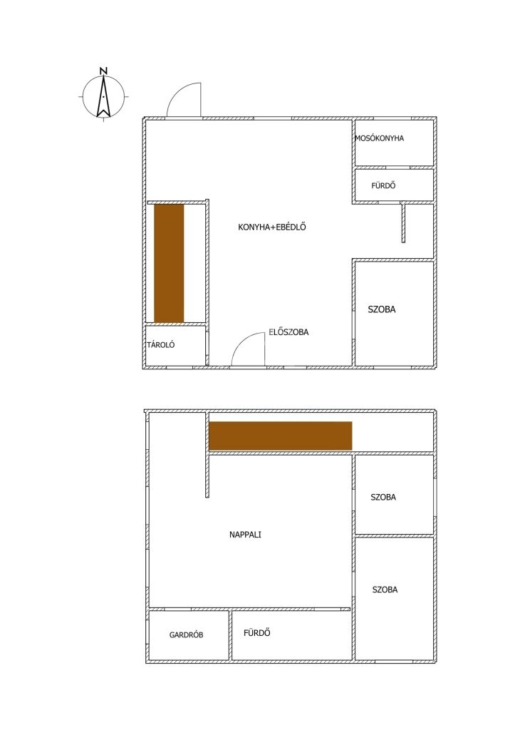 -földszint: hálószoba, konyha + ebédlő, tároló, fürdőszoba, mosókonyha