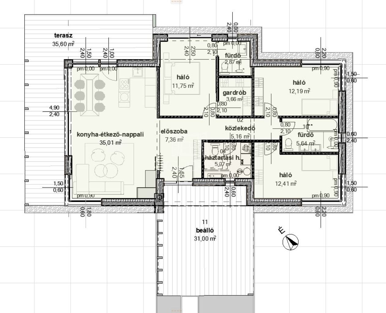 - A modern stílusú épület amerikai konyhás nappali, 3 szoba, 2 fürdőszoba, közlekedő, gardrób, valamint háztartási-gépészet helyiségekből áll, melyhez autóbeálló és terasz kapcsolódik.