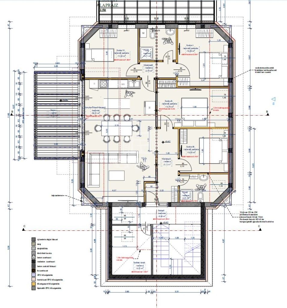 - A bruttó 140 m² alapterületen praktikus elrendezésű, világos, élhető terek kerültek kialakításra: 4 szobával, tágas amerikai konyhás nappalival, fürdőszobával, WC-vel, előtérrel.