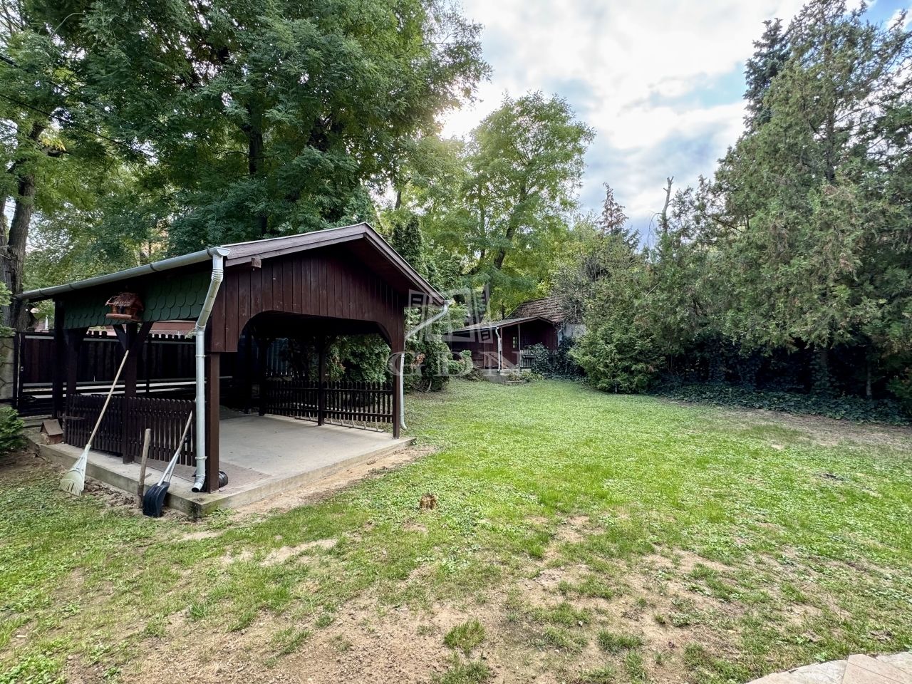 A parkosított kertben egy kis fa tároló, beton alapú szaletli és nagy füves terület áll rendelkezésre a szabadidő eltöltéséhez.