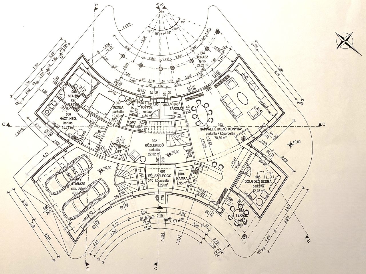 Az alsó szinten a teljes gépészet, tárolók és a ház működését kiszolgáló helyiségek kaptak helyet, míg a földszinten a mindennapi élet központja tárul elénk: egy tágas, amerikai konyhás nappali étkezővel, kamrával kiegészítve, dolgozószoba, valamint egy külön fürdőszobás vendégszoba biztosítja a kényelmet. A szintet egy kétállásos garázs, háztartási helyiség, valamint egy szauna zuhanyzóval teszi teljessé, miközben a nagy belmagasságú közlekedők tovább erősítik a térérzetet.