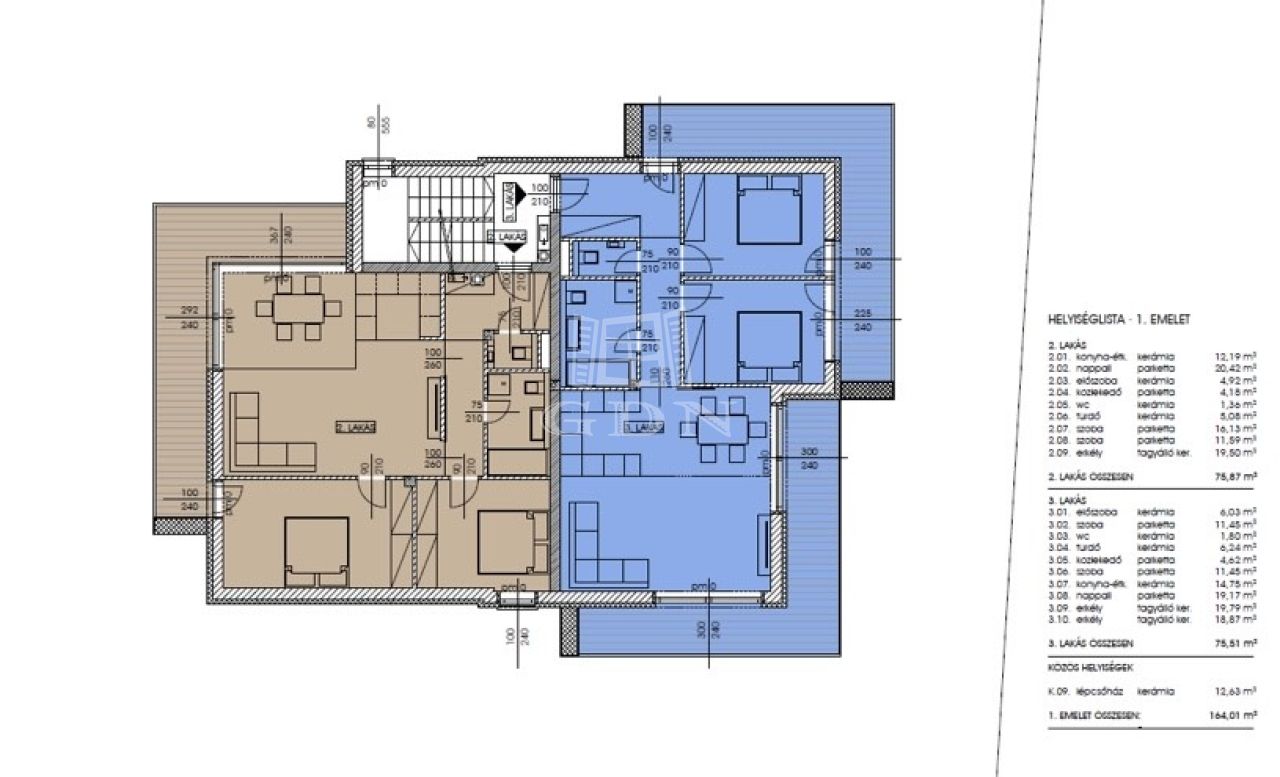 Ez a napfényes, első emeleti, 75,87 m²-es lakás két nagy méretű terasszal (összesen 38,66 m²) rendelkezik, így ideális választás azoknak, akik szeretik a tágas, világos tereket és a szabadtéri életteret.
