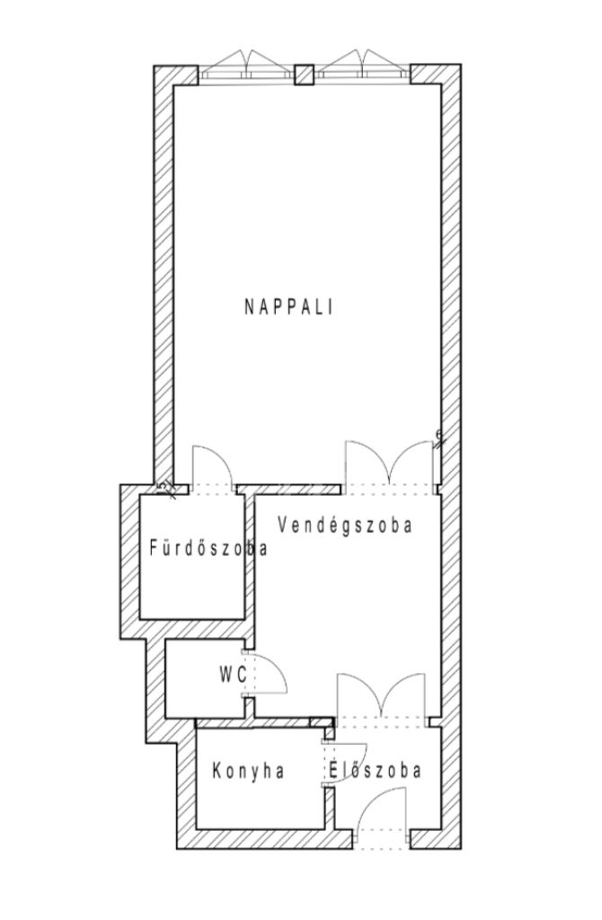előszoba, hall, melyből egy szoba nyílik, étkező, konyha, fürdőszoba, vendég-WC.