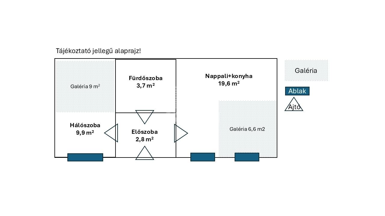 Galériák: 2 db (nappaliban és a külön szobában is, 9+6,6 m2 )