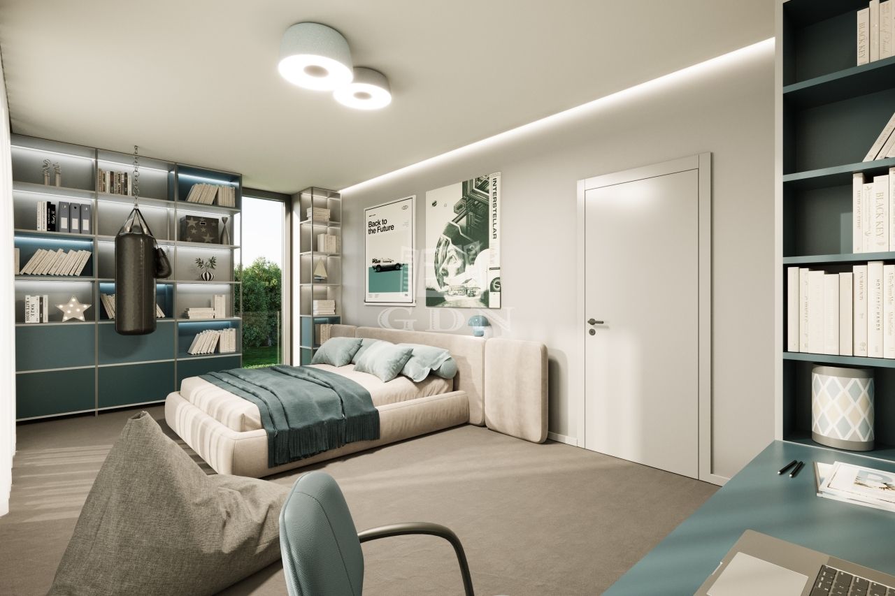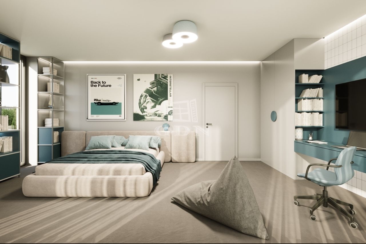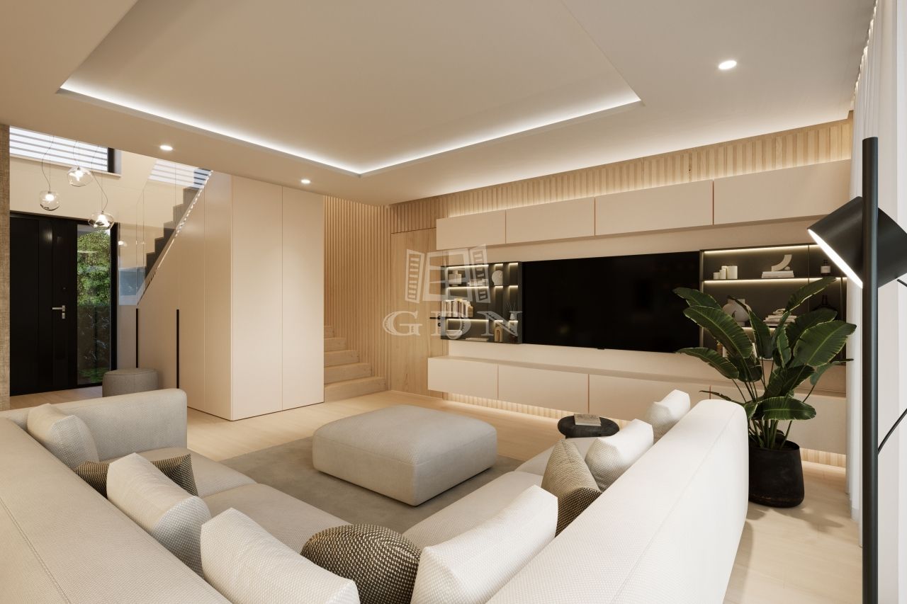 Az épület földszintjén kap helyet a közösségi zóna, valamint szeparáltan a privát helységek, szülői háló, fürdő, gardrób.