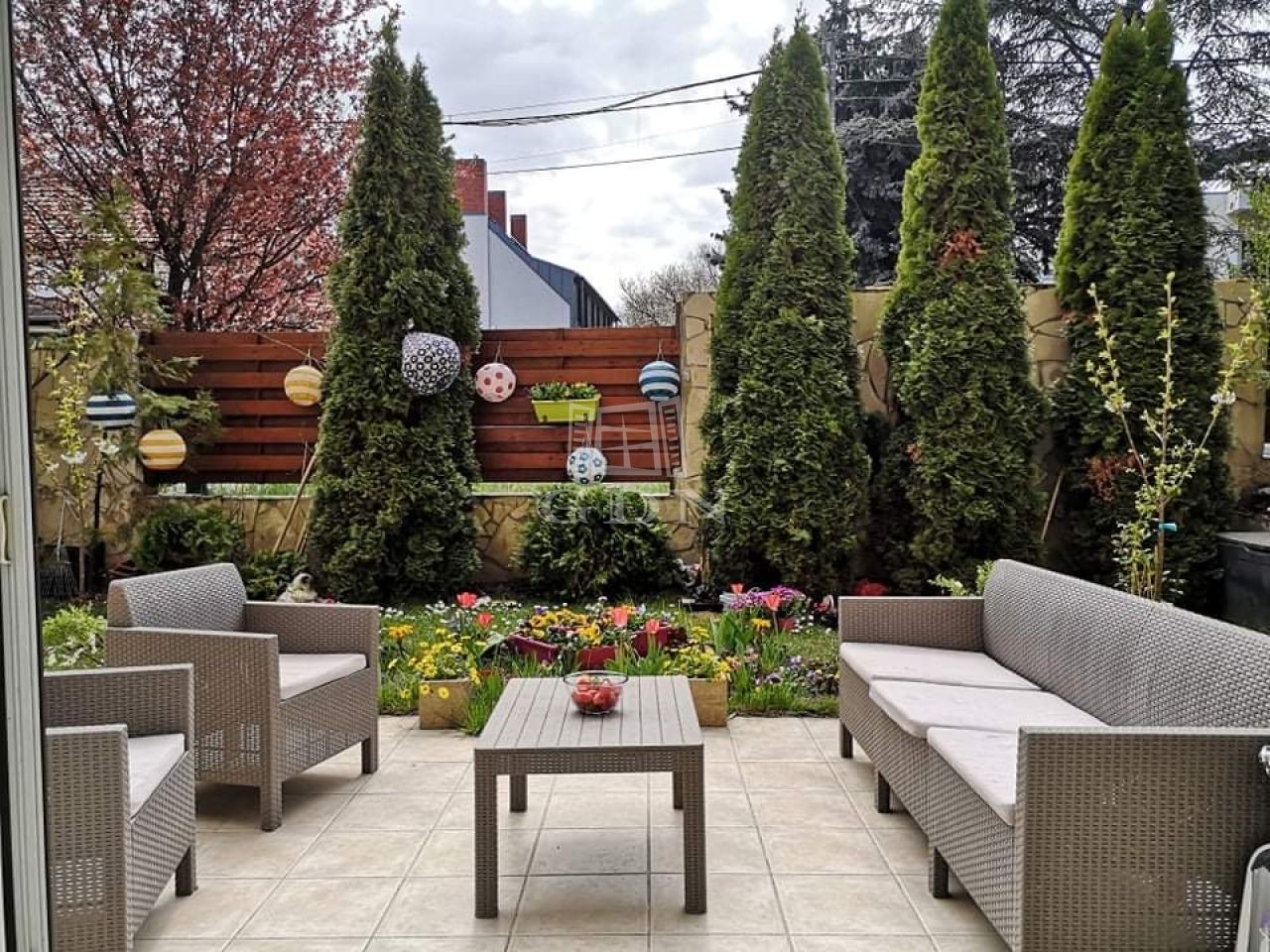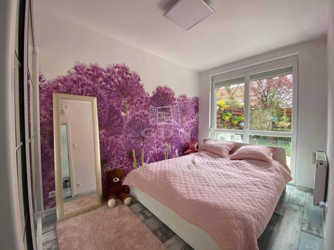 Mindkét szobából közvetlen kijárat nyílik a tágas teraszra, amely ideális helyszíne a pihenésnek vagy baráti összejöveteleknek, miközben a kert zöldje kellemes, intim hangulatot teremt.