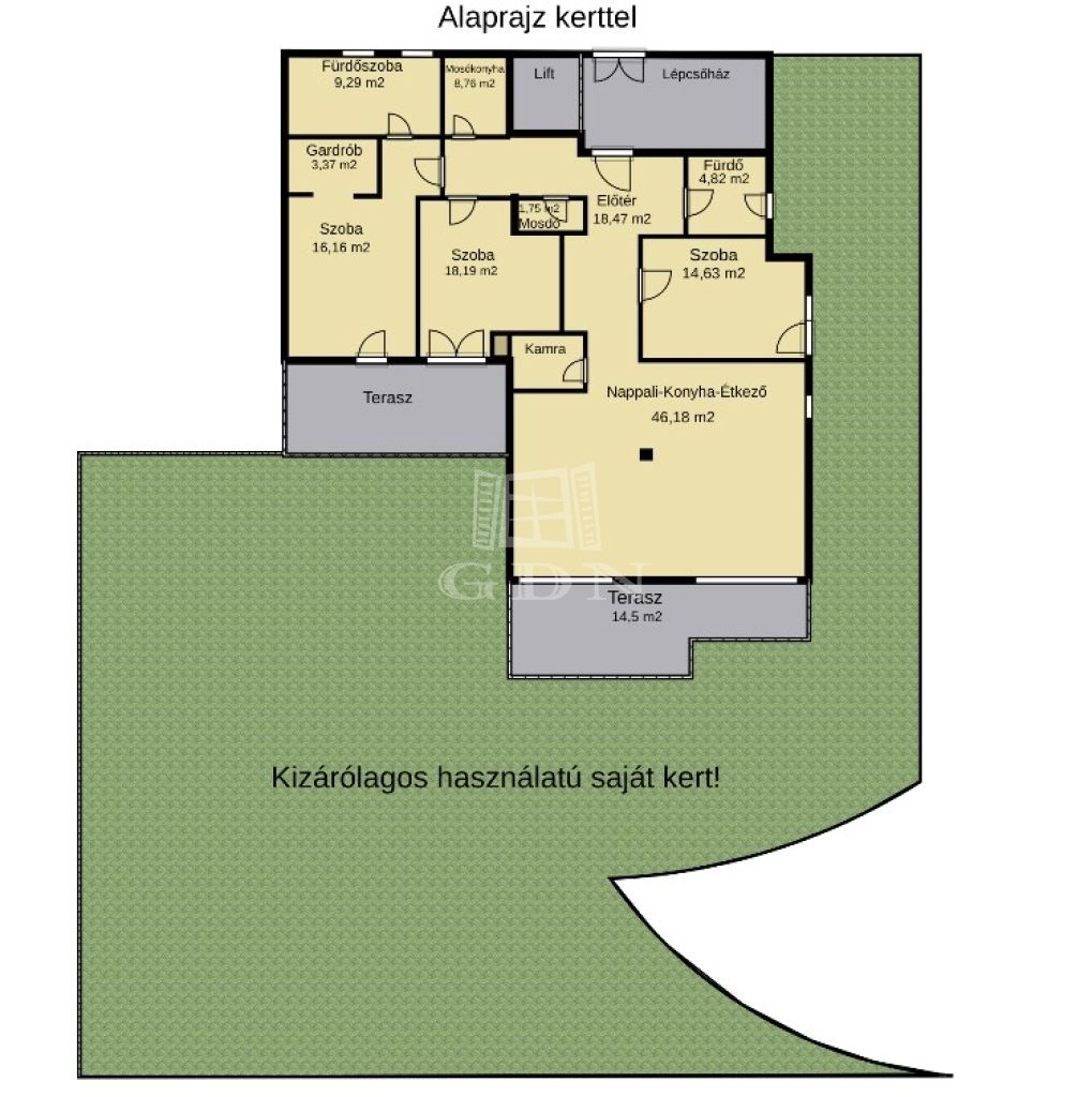 A lakás egyik legnagyobb értéke, hogy minden helyiség közvetlen kertkapcsolattal rendelkezik,