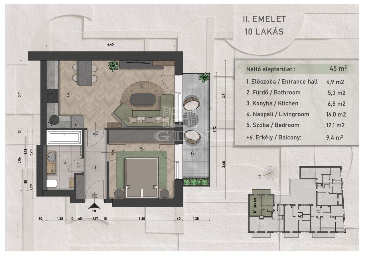 | 45 m2Alapterület | 2 Szoba |