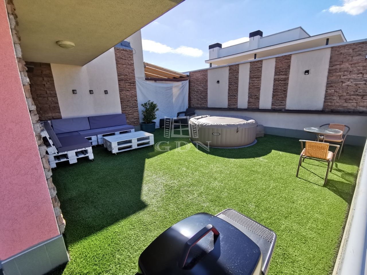 A műfűvel borított, délnyugati tájolású terasz több, mint egyszerű kültér: egy saját városi oázis, ahol a naplemente fényei mellett grillezhet barátokkal, élvezheti a jakuzzi nyújtotta pihenést, vagy egyszerűen csak csendben feltöltődhet a város felett.