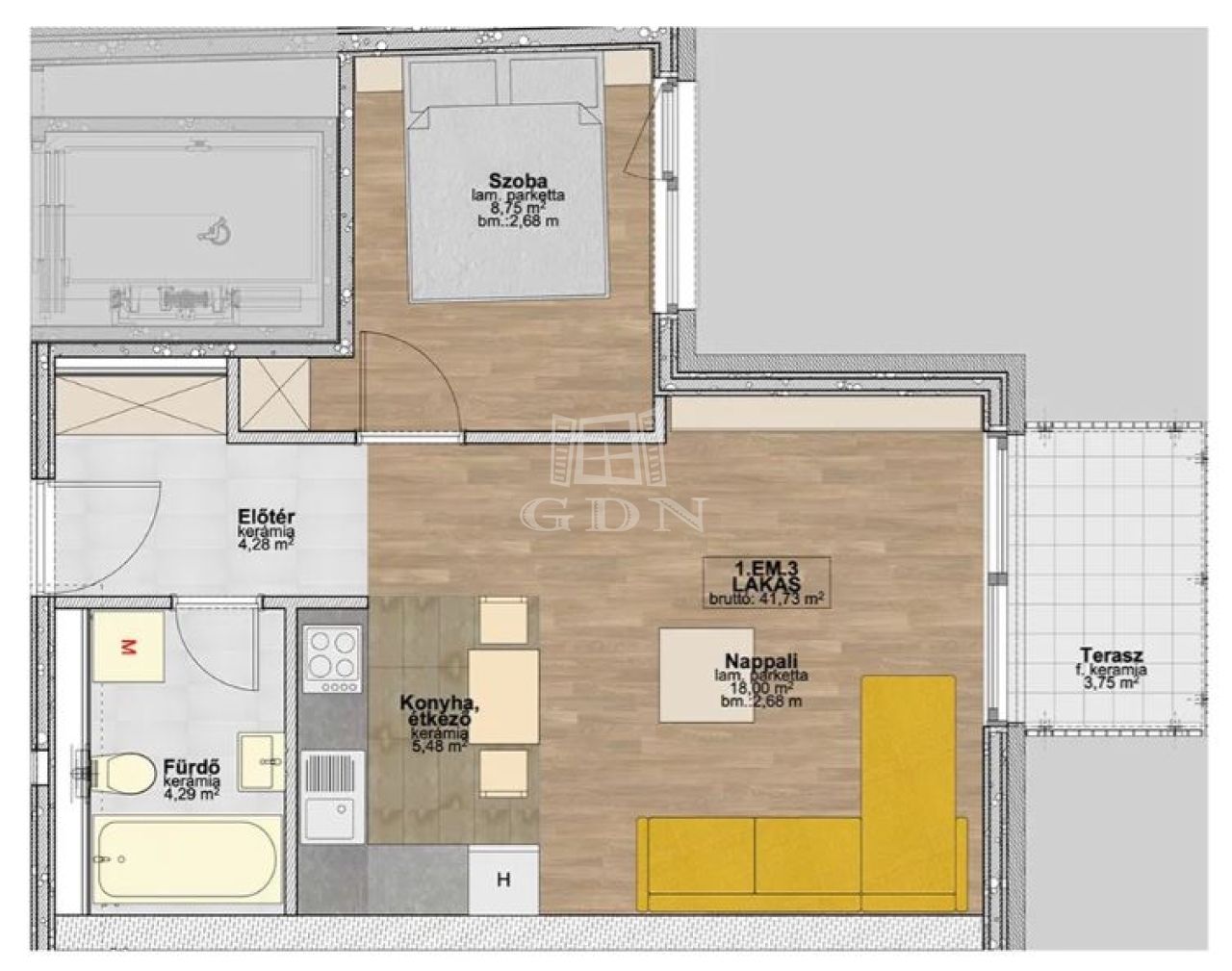 | 40 m2Alapterület | 2 Szoba |