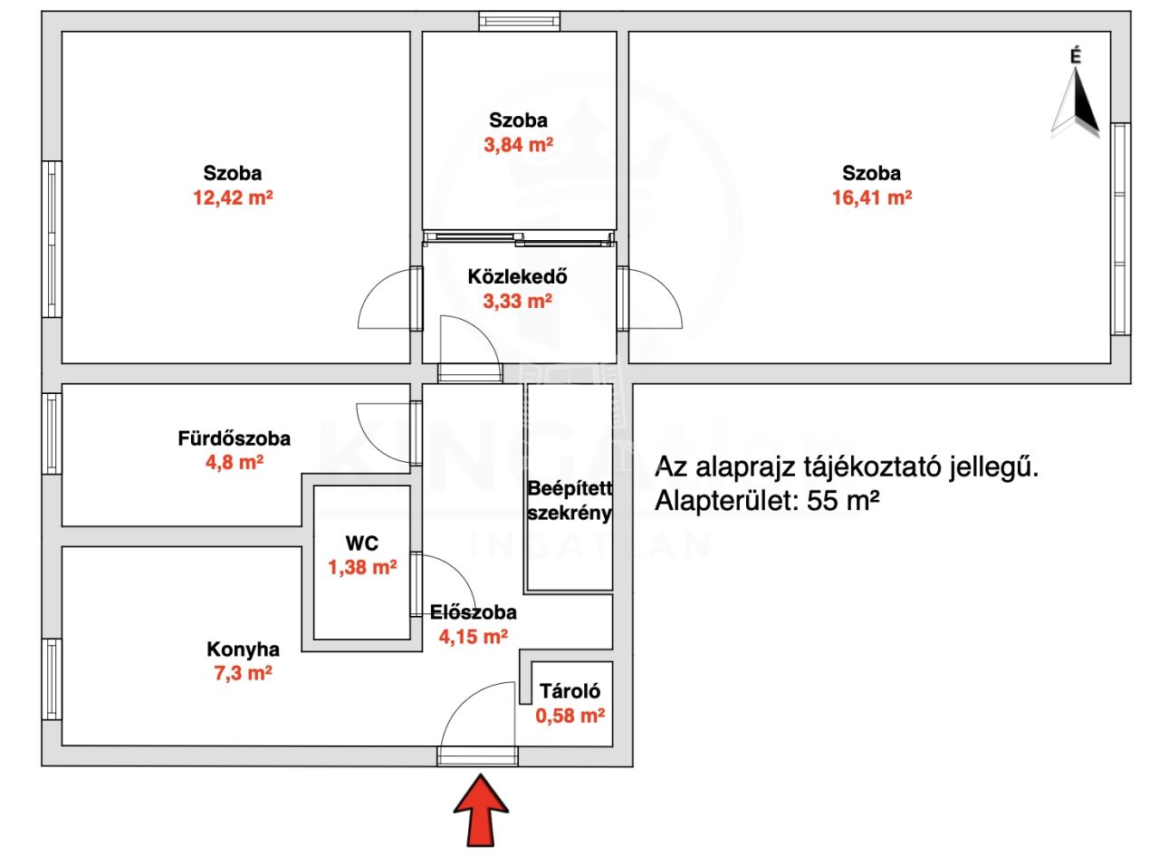 Átgondolt elrendezésének köszönhetően a tágas 18 nm-es nappali, a 13 nm-es szoba, a hálónak kialakított félszoba, a bútorozott, gépesített konyha, a kádas fürdőszoba, a gardróbos előszoba, valamint a külön WC praktikus, jól használható tereket biztosítanak.