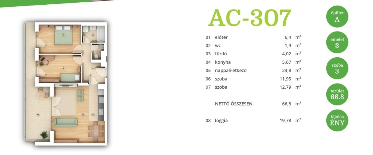 Ez a lakás nappali+2 hálós, 67nm alapterületű és tartozik hozzá egy 20nm-es terasz is.