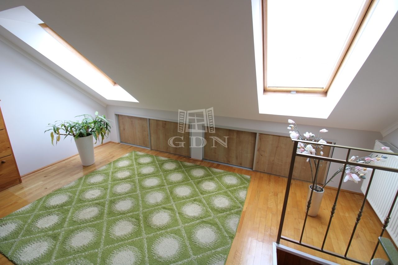 A felső szintre egy kényelmes fokkiosztású lépcsőn juthatunk fel, ahol is a br. 14nm terjedelmű világos előszoba (itt akár külön dolgozó vagy közösségi tér is kialakítható) valamint a 6nm-es kádas duplamosdós fürdő, kettő egyenként br.15,6 és 14nm terjedelmű hálószoba és egy közel 5nm es gardrób került kialakításra.
