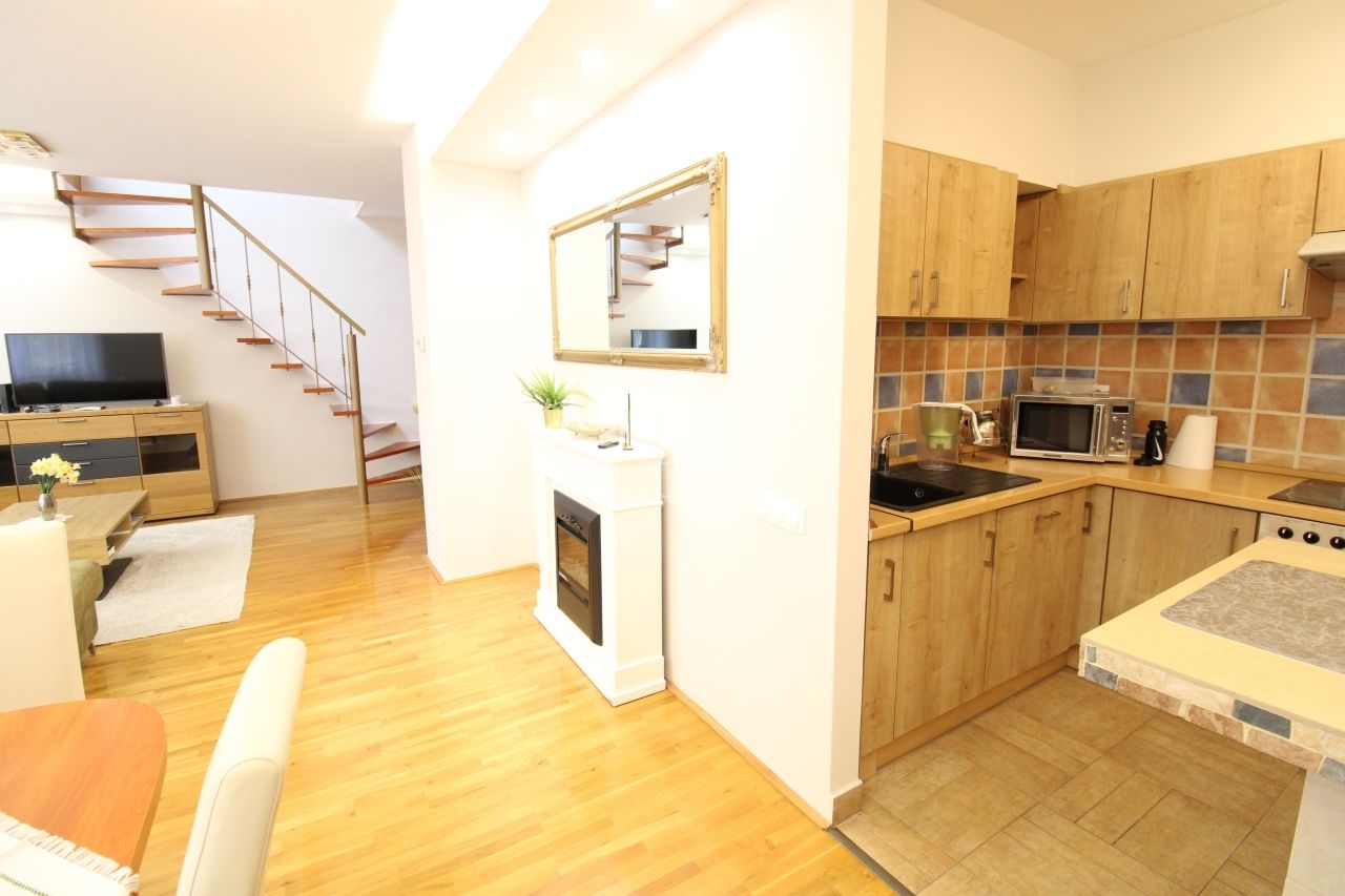 A lakás alsó szintjén egy 41nm nagyságú amerikai konyhás nappali az abból nyíló 4nm-es erkély, valamint a közel 6nm-es zuhanyzós fürdő kapott helyet.