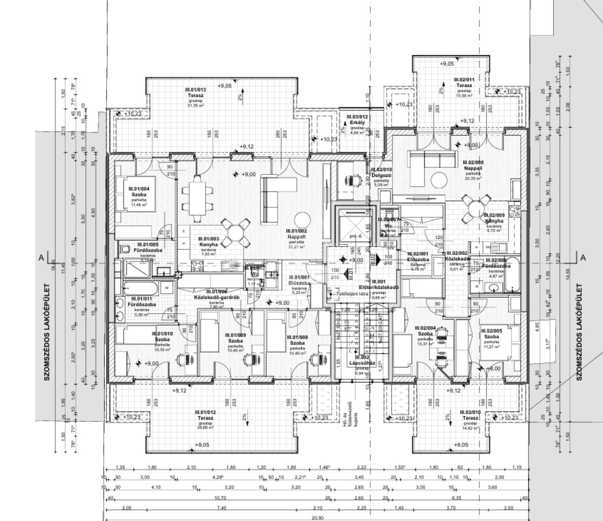 -Erkélyek, teraszok, valamint tetőteraszos lakások