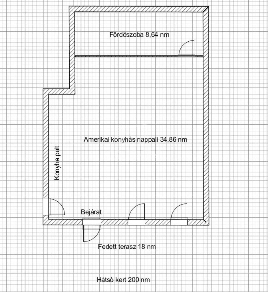 Alapterülete 44 nm, jelenleg 1 nagy szobás, amerikai konyhás elosztású, de könnyedén 1,5-2 szobássá alakítható több féle alaprajzi lehetőséggel.