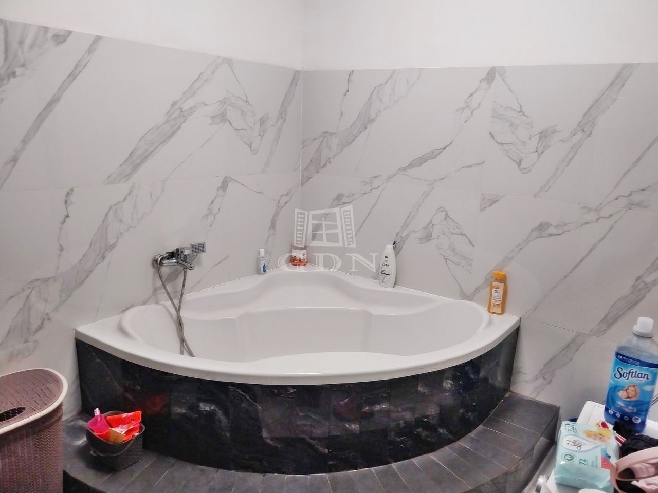 Kényelmes méretű fürdőszobája nagy sarokkádal és épített zuhanyzóval is rendelkezik emelve a komfort érzetet.