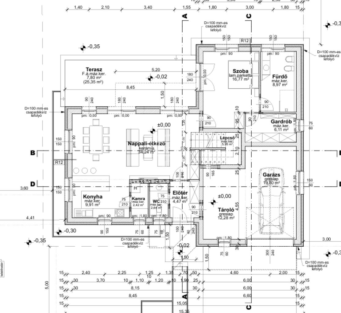Földszint – 131,36 m² (lakótér + garázs + tároló + fedett terasz):