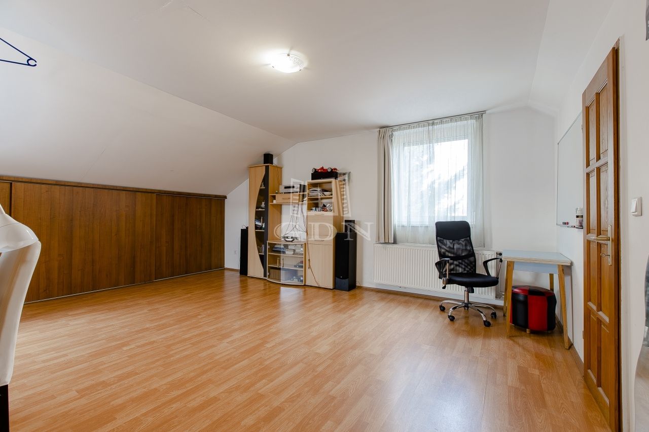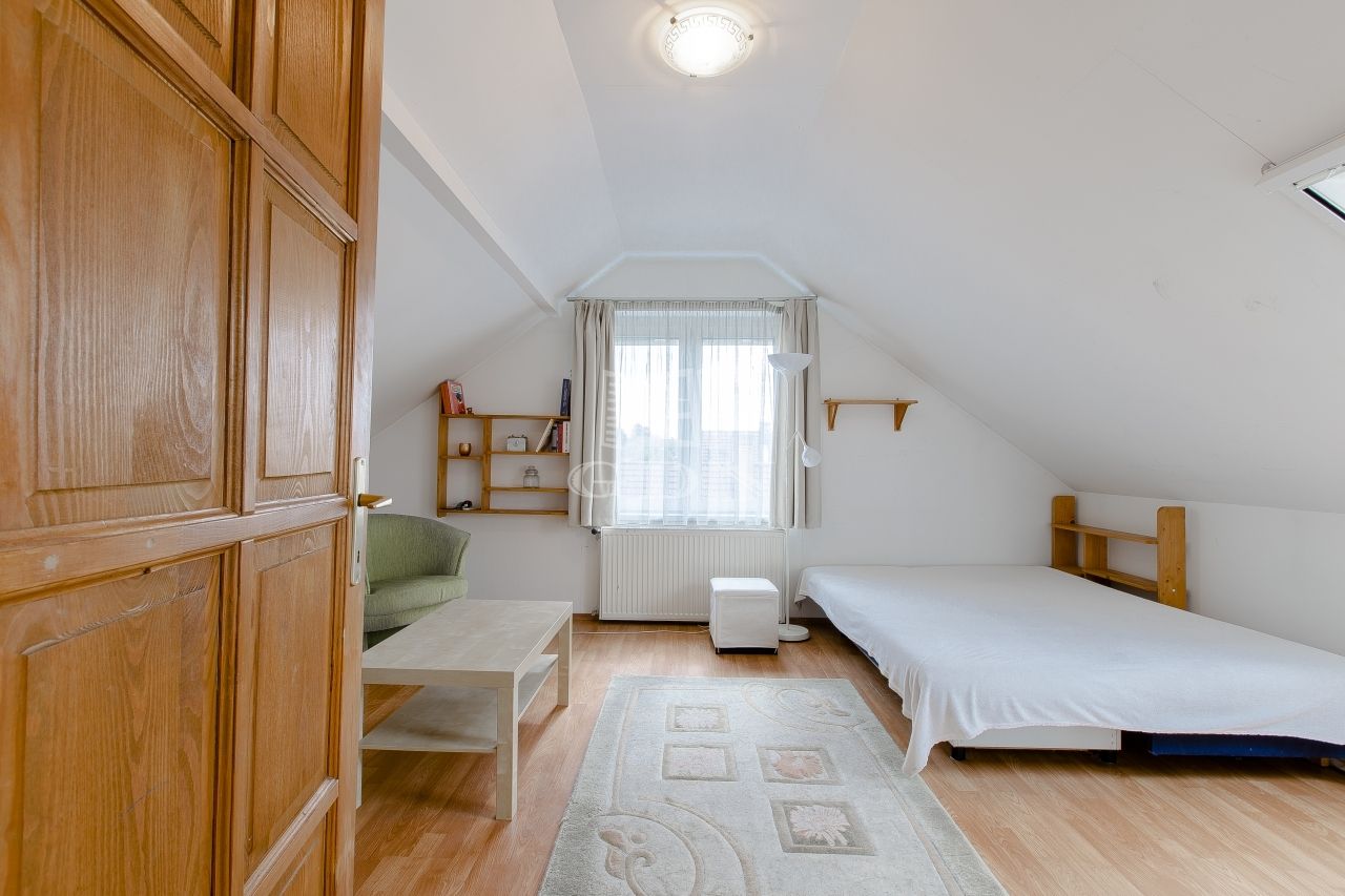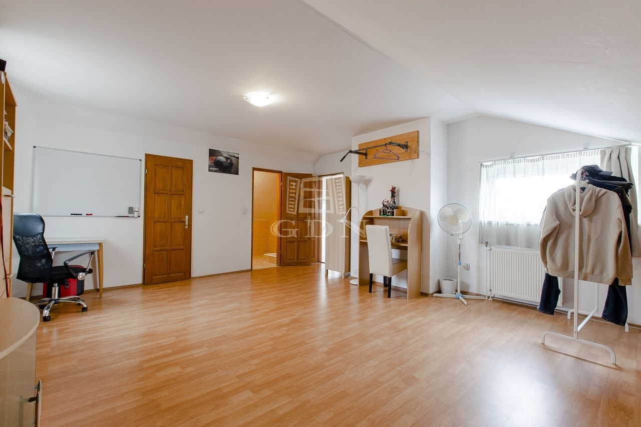 Szintén a közlekedőből jutunk fel a beépített teljes értékű tetőtérbe, ahol ki lett alakítva 2 db külön nyíló szoba, gardrób helyiség és egy zuhanyzós fürdőszoba. A nagyszoba további lehetőségeket rejt magába, szinte bárhogy lehet alakítani, akár 2 db szobává is.