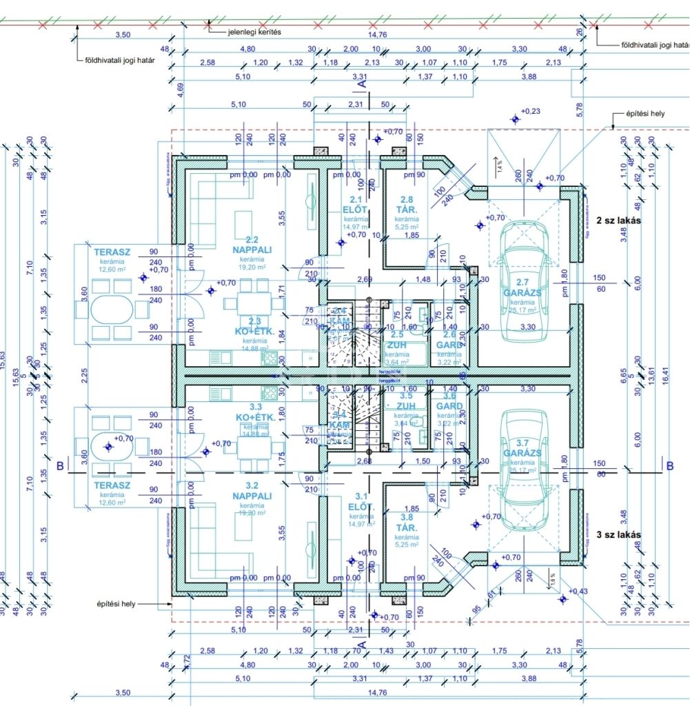 Telek: 1300 m² összesen (lakásonként min. 400 m² saját, leválasztott rész)