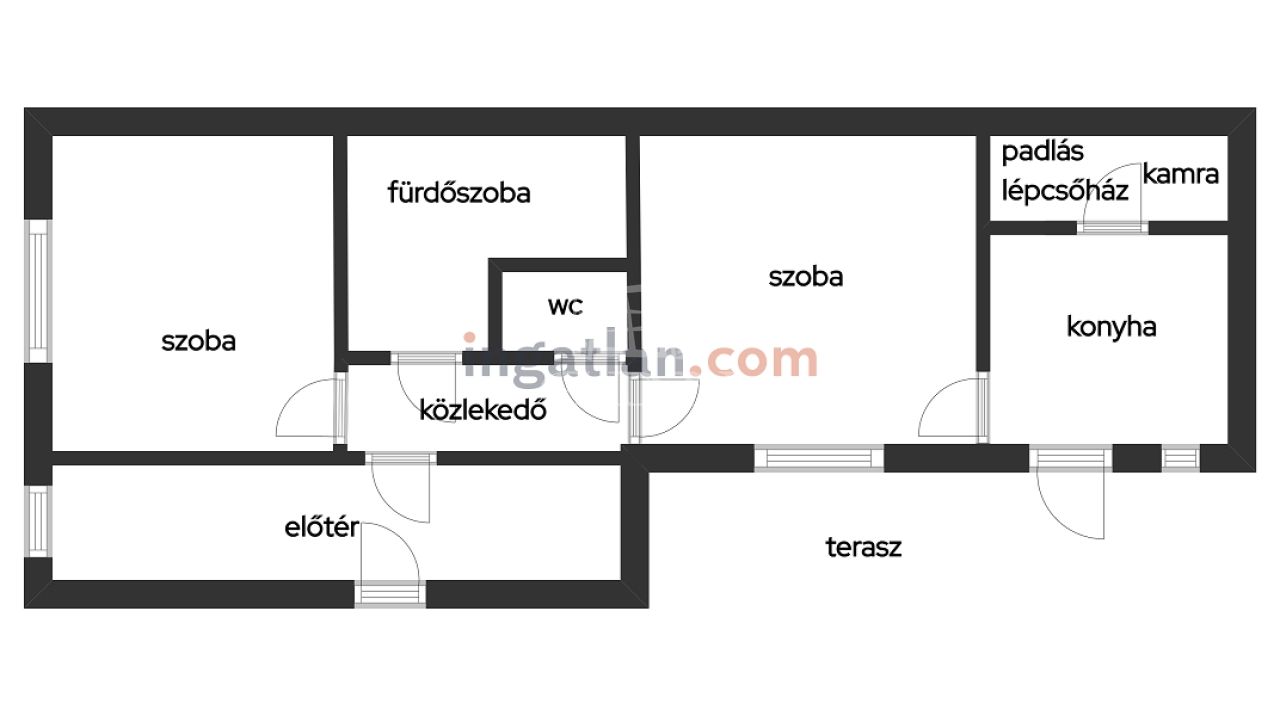 Az első bejáratnál egy hosszúkás előszoba van, melyből egy közlekedőn át nyílnak a szobák, a fürdő és a WC. A nappali mögött található a konyha, ahonnan a teraszra nyílik a hátsó ajtó.