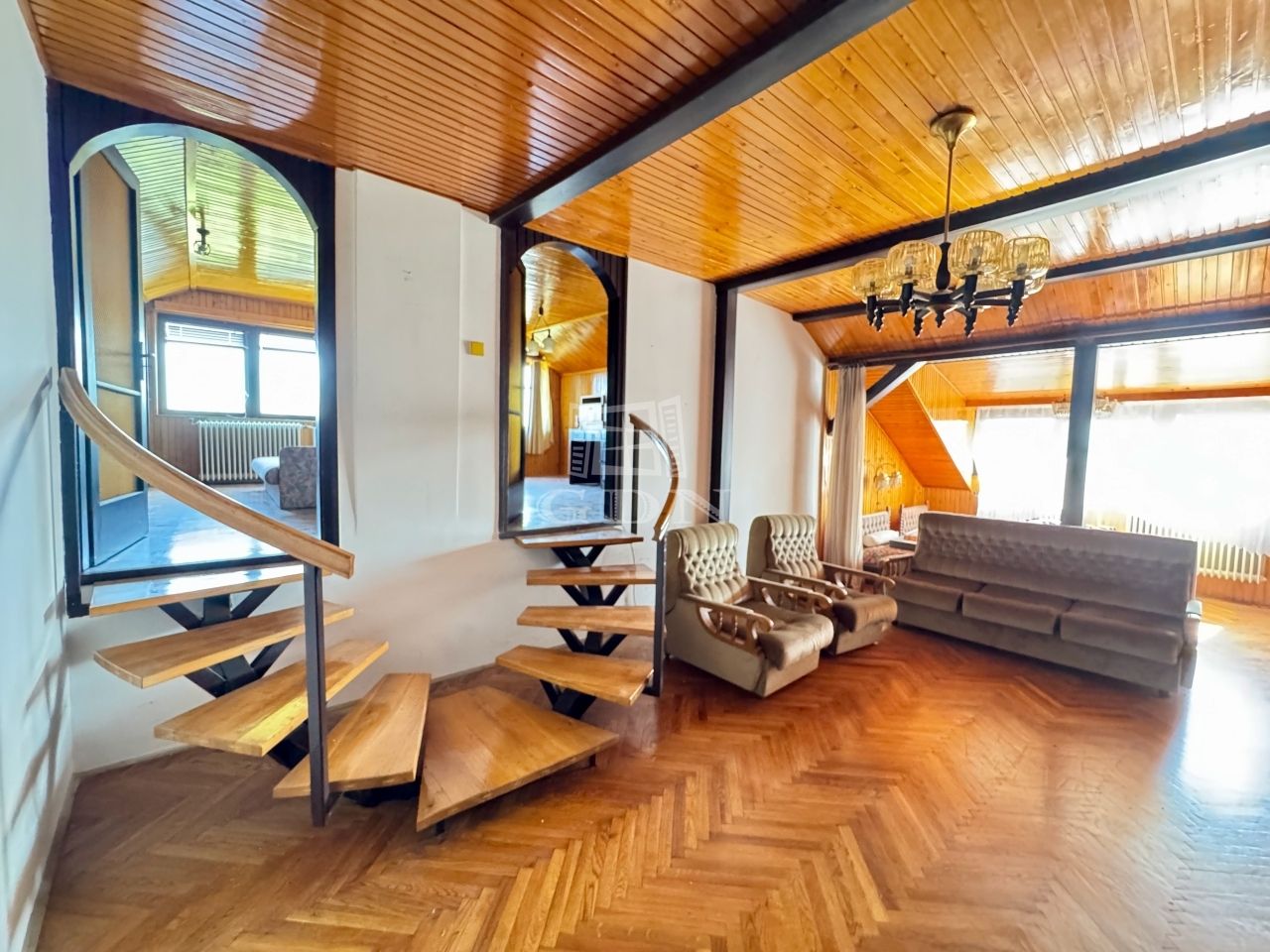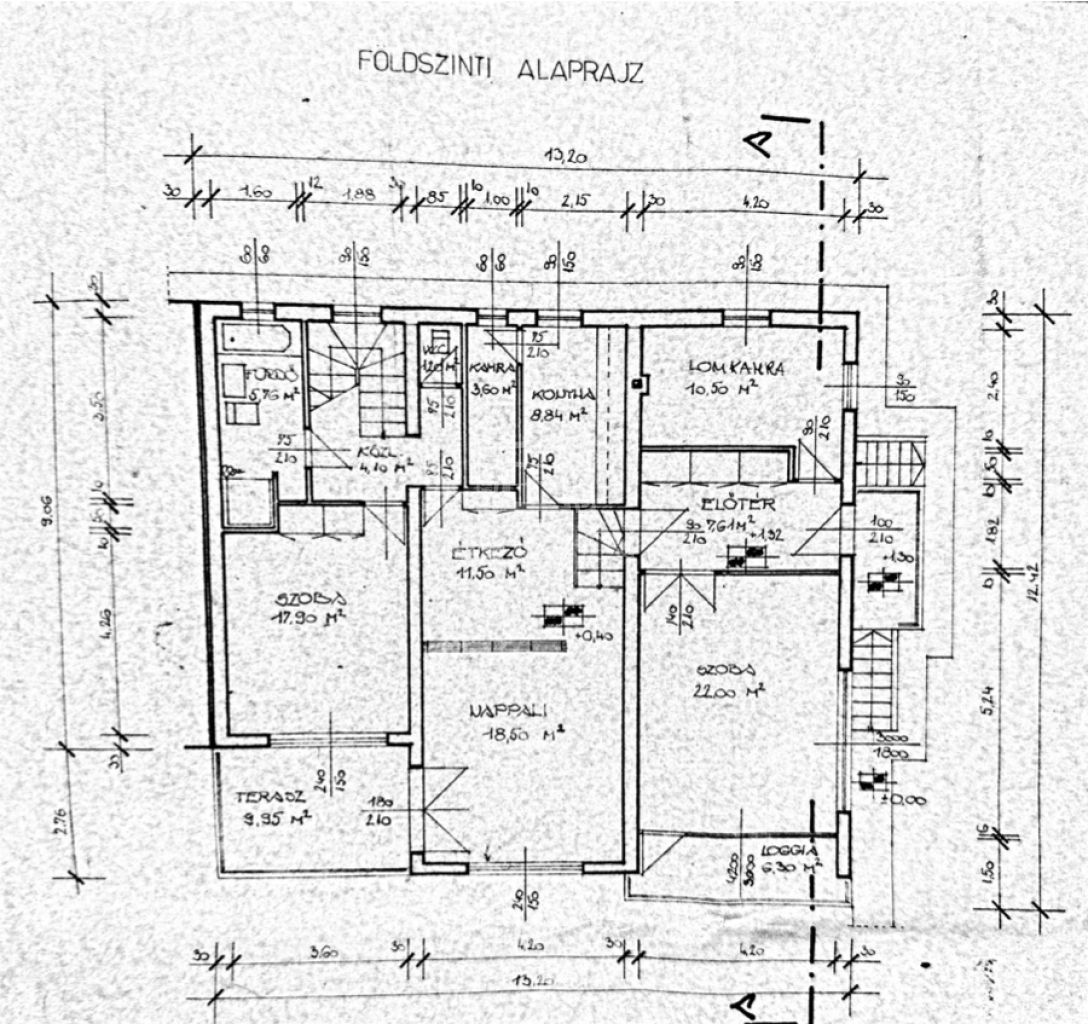 - Földszint: előtér-szoba (17,9 m2), nappali (30 m2), konyha (5,76m2), WC (1,2m2), fürdőszoba (12,4m2), közlekedő (7,6m2), 2 szoba(10,5m2; 22m2), terasz ( kb.40m2).