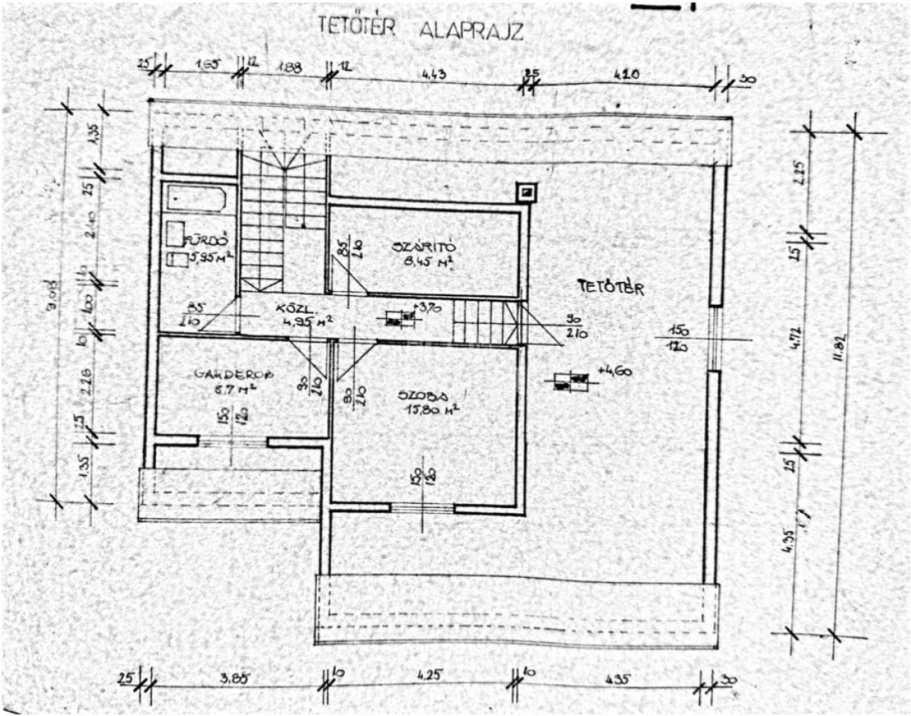 - Emelet: közlekedő (4,95m2), fürdőszoba+WC (5,95m2), konyha (8,45m2), 4 szoba(15,8m2; 8,7m2; 13m2; 6m2)