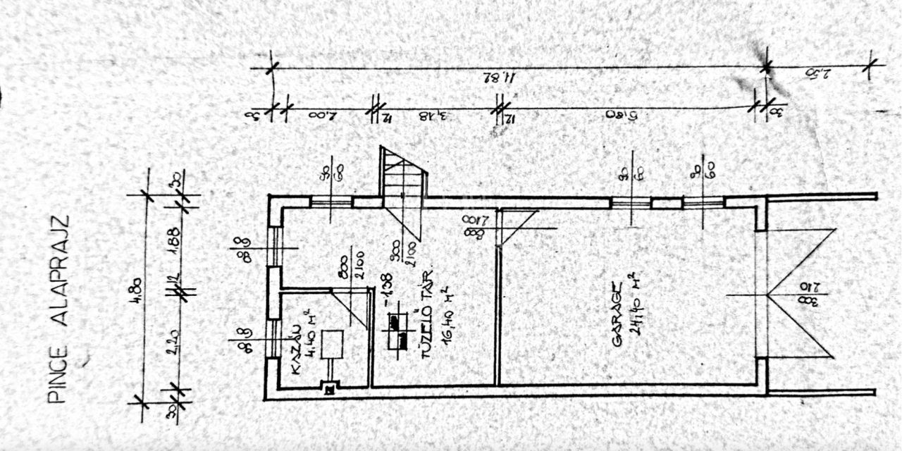 - Pince: tároló (24,4m2), tároló (16,4m2), kazánház (4,4m2), dupla garázs (40m2).