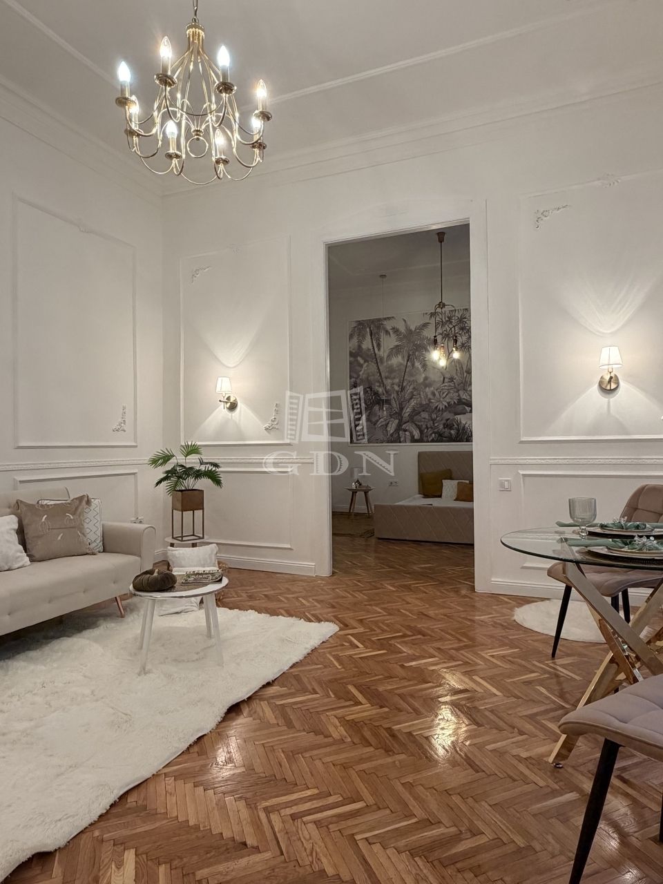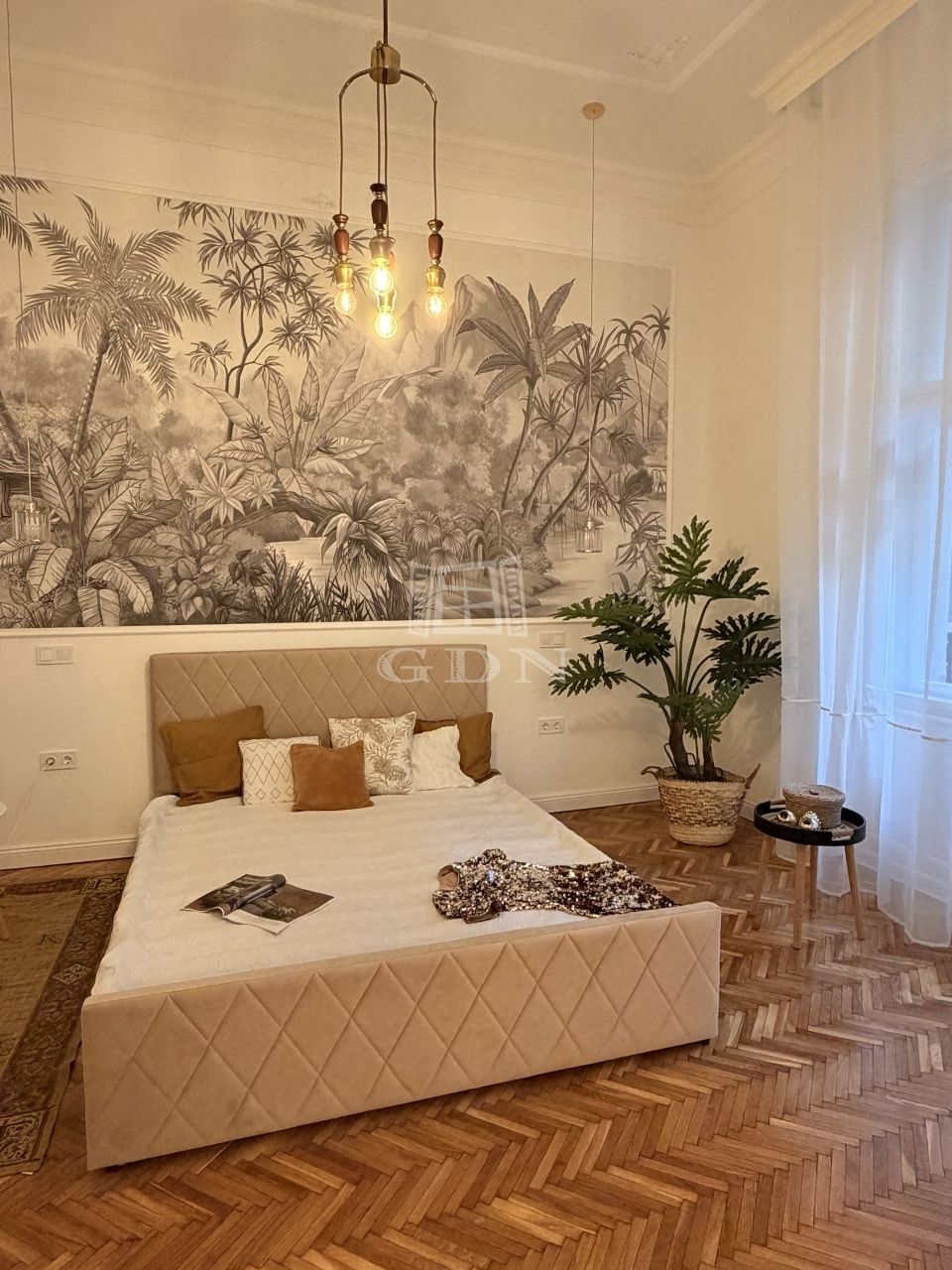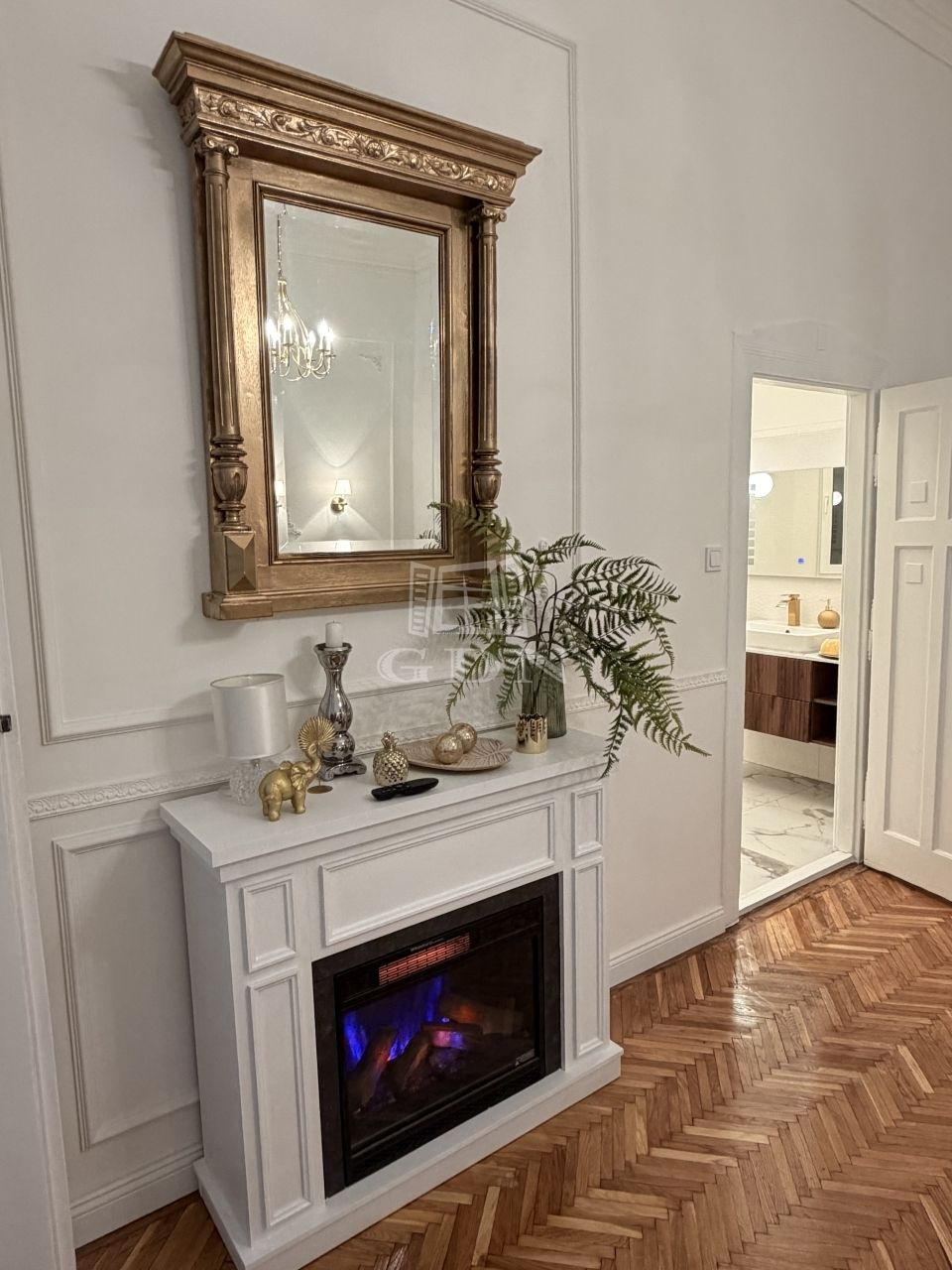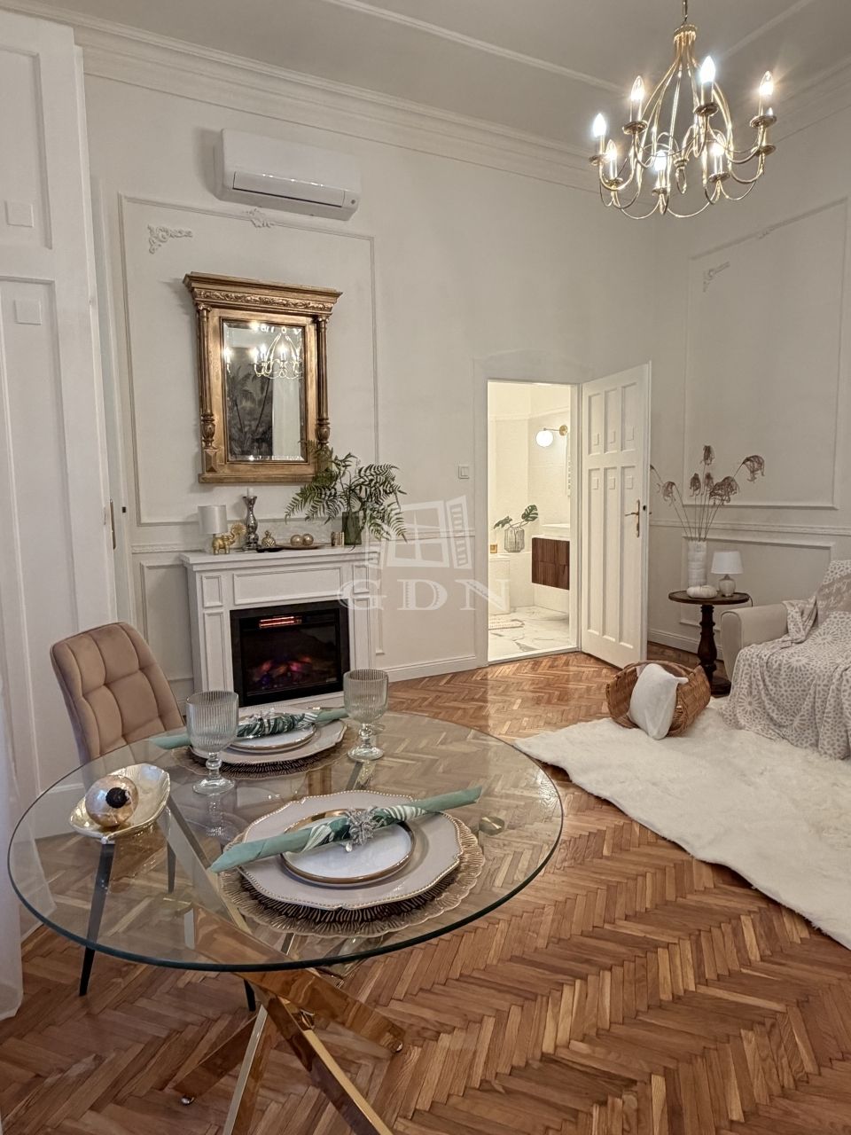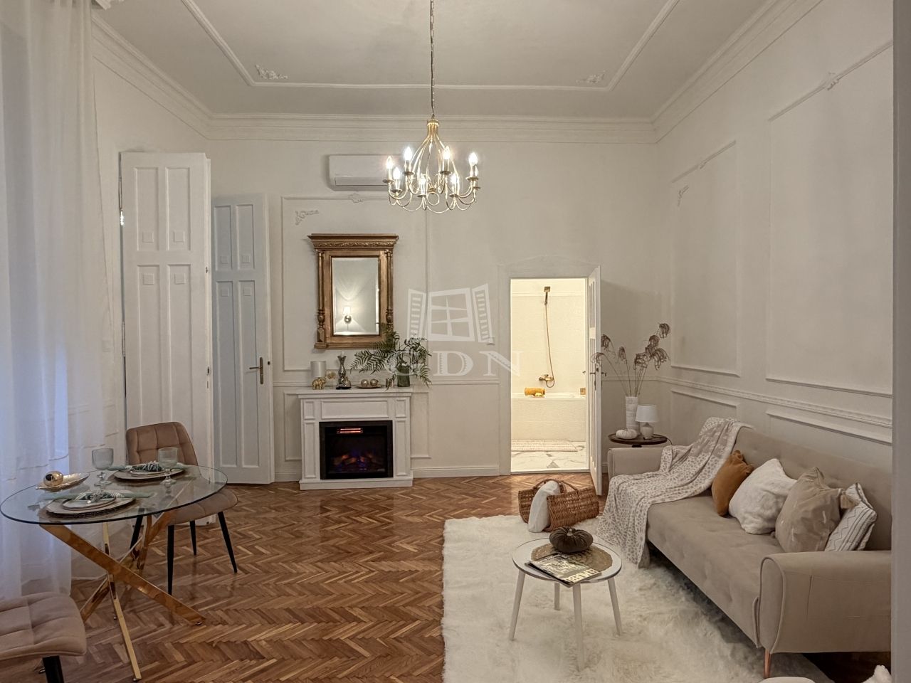 A lakás tágas belmagassággal, elegáns stukkókkal, halszálkás parkettával, valamint hangulatos elektromos kandallóval rendelkezik. A nagy méretű ablakok bőséges természetes fényt biztosítanak. A modern komfortot hűtő-fűtő klímaberendezés szolgálja. Az ingatlan azonnal költözhető.