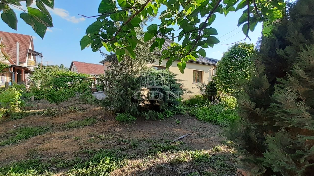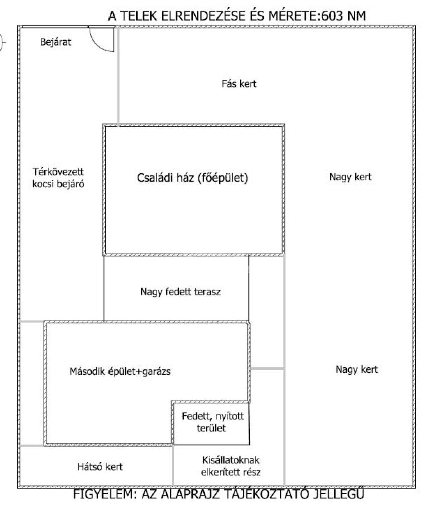 A szépen karbantartott zöld területen megtalálható egy szőlőlugas, kis állatoknak akár külön terület, rengeteg fa és termések, ami még szebbé teszi a telket. A telken még található egy nagy fedett terasz (28 nm), amely összeköti a két épületet, ami természetesen térkövezet.