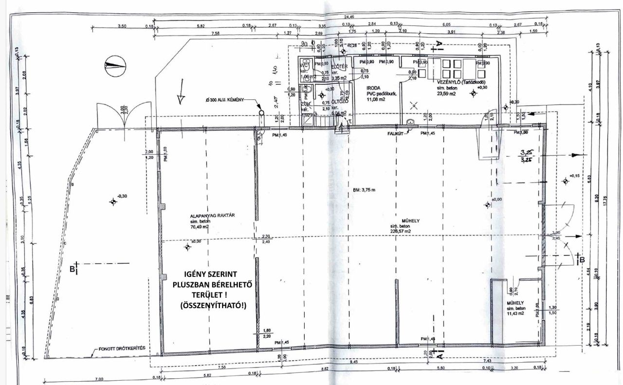 FIGYELEM: igény szerint az alaprajzon látható ALAPANYAG RAKTÁR ( 76,49 m² ) pluszban bérelhető a területhez, ebben az esetben az össz. alapterület: 361,49 m² lenne. Ez a terület jelenleg leválasztásra került, de kérésre egybenyitható / hasznosítható !