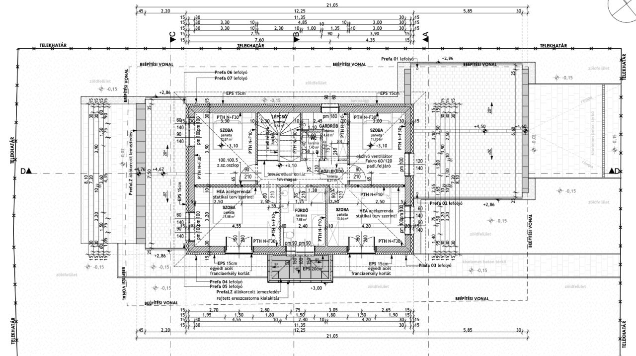 - főfal 15 cm EPS, aljzatban 12 cm, födémen 25 cm szigetelés