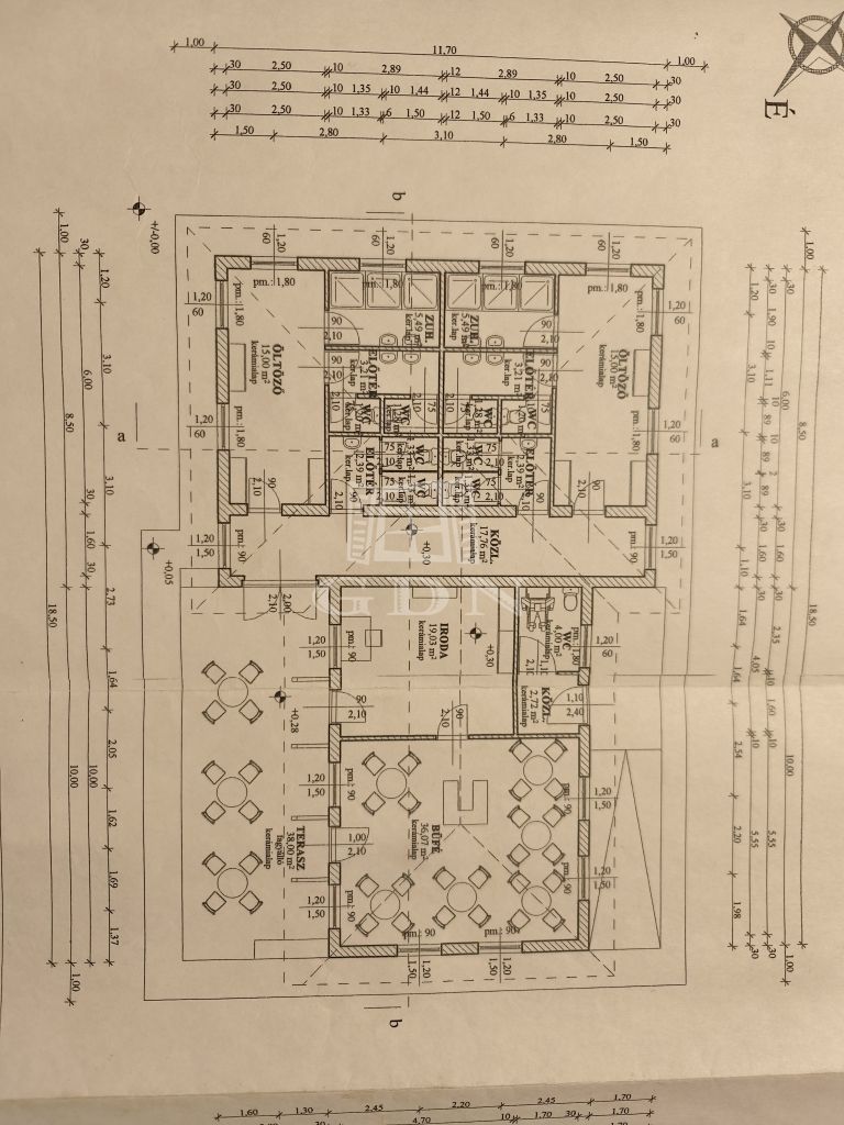 A kiszolgáló épületben (198 nm) recepció, büfé, öltözők, zuhanyzók, mosdók, terasz állnak rendelkezésre.