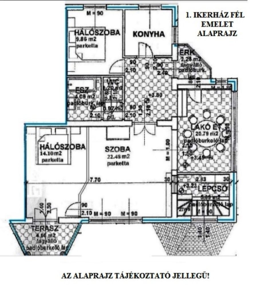 EMELET – 85 m2: 3 szoba, konyha, fürdő, wc, közlekedő, lépcsőház, 2 erkély
