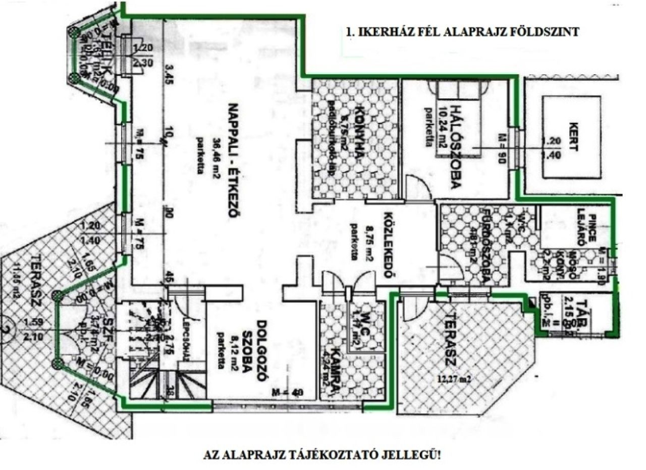 FÖLDSZINT – 96 m2: nappali+étkező, konyha, 2 szoba, fürdő, 2 wc, mosókonyha, tároló, közlekedő, előtér, lépcsőház, terasz (12 m2), pince