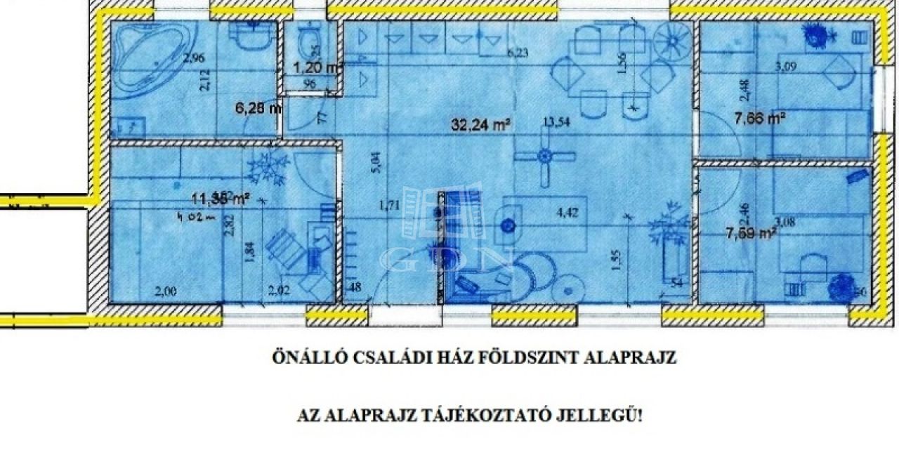 A 65 m2 alapterületű épület jelenleg VÁLLALKOZÁS CÉLJÁRA van hasznosítva, amely további ötletet adhat az új tulajdonos elképzeléseinek. Az ingatlan - ahogy az alaprajzon látható - 4 szobás lakóházzá visszaalakítható.