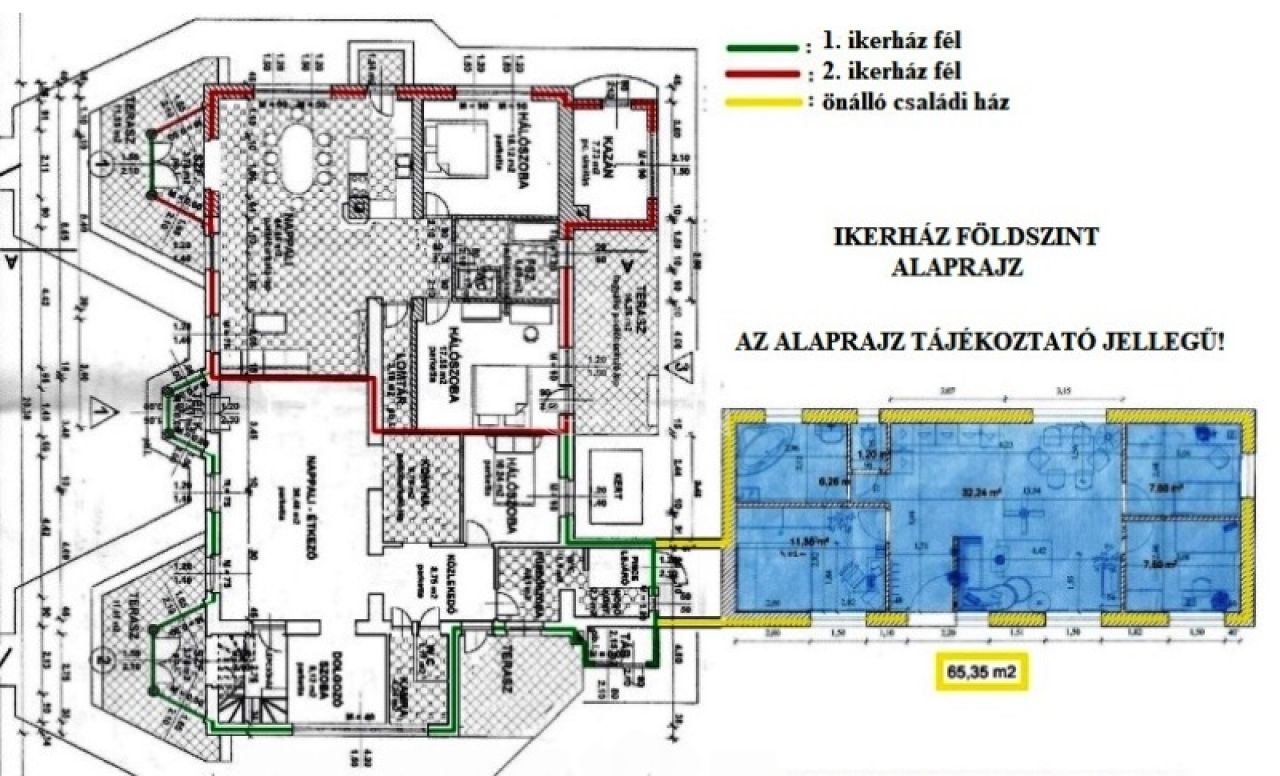 DUNAHARASZTI egyik legszebb, központhoz közeli részén, igényes környezetben, ÖNÁLLÓ helyrajzi számmal rendelkező 195 m2 alapterületű, 2 LAKRÉSZBŐL álló, 2 szintes, 6 szobás, dupla komfortos IKERHÁZ és a telken lévő KÜLÖNÁLLÓ, 65 m2 alapterületű, 2 szobás CSALÁDI HÁZ fedett autóbeállóval, teraszokkal, pincével, és a hozzá tartozó parkosított 1500 m2 rendezett telekkel ELADÓ.
