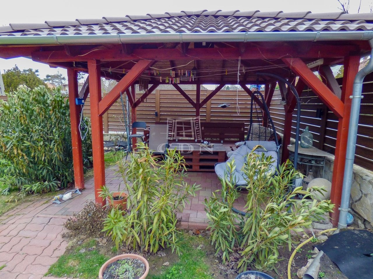 A zárt udvaron 3 autóval meg lehet állni, ebből 2 fedett, az elektromos hálózat felbővített (3*16 A), a kertben egy nagy terasz (20 nm), szaletli (16nm), tároló (20 nm), bográcsozó kapott helyet. Az öntözés fúrt kútról megoldott, a kerítés gondozásmentes.
