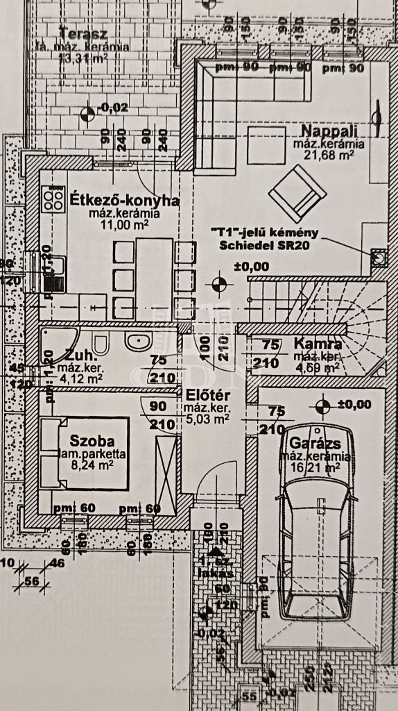 földszint: amerikai konyhás nappali, spájz, hálószoba, fürdőszoba mosdóval, közlekedő, garázs.