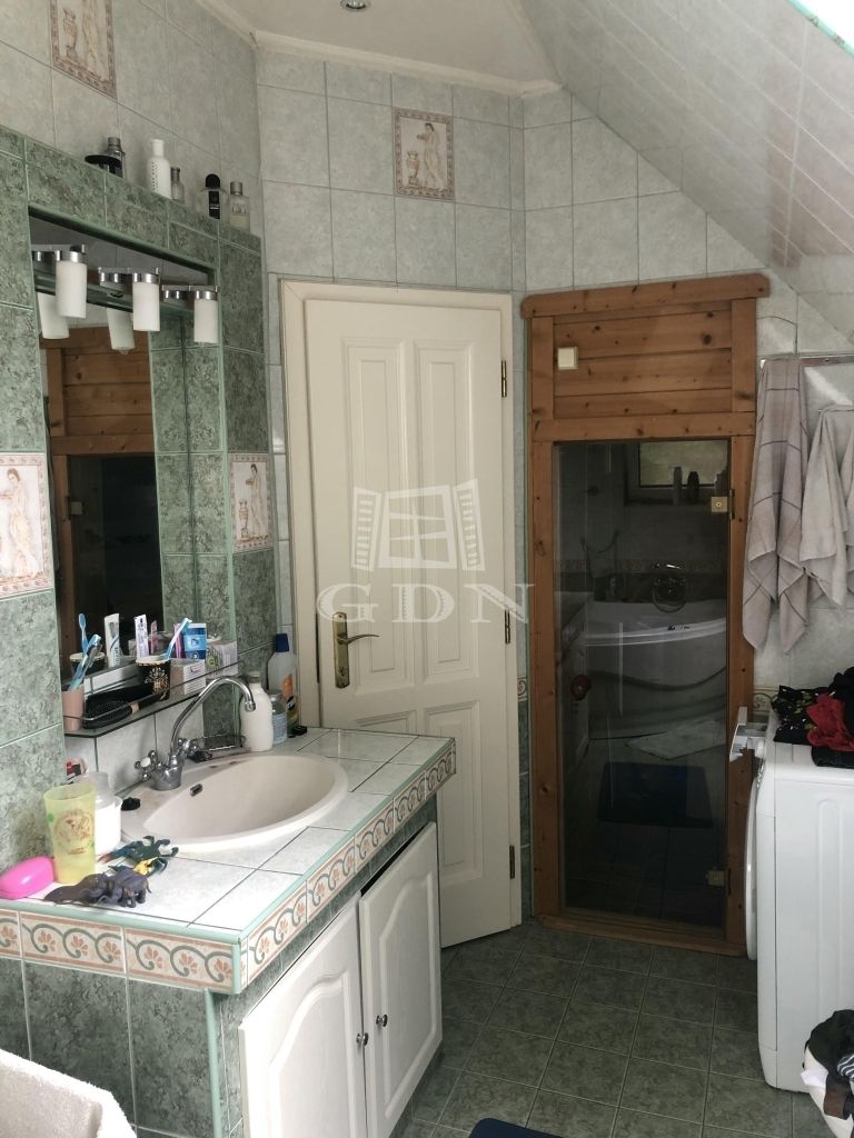 - beépített tetőtér, lényegében csak 2 lépcsőfokkal helyezkedik el magasabban a nappalinál, így majdhogynem egy teret alkotnak. Itt egy tágas előtérből közelíthetjük meg a 3 hálószobát, és egy fürdőszobát, amelyből egy szaunába jutunk el.