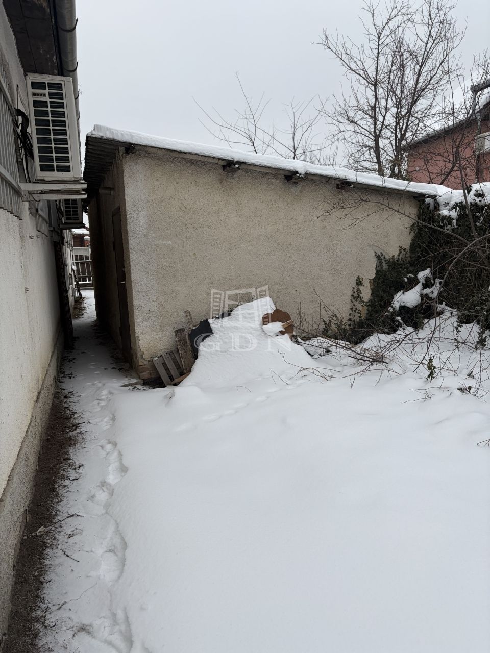 A ház elkőkertet követően helyezkedik el a telken, majd mögötte egy tégla szerkezetű kb 15 nm nagyságú tároló található, amely mellett 6 autó beállására alkalmas udvar fekszik. A terület rendezett, körbekerített.