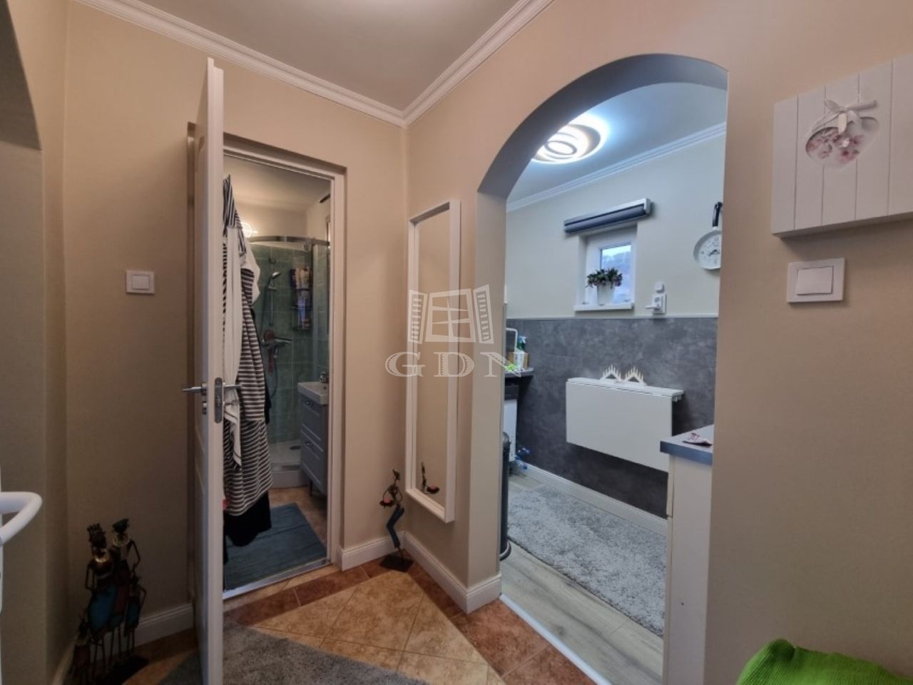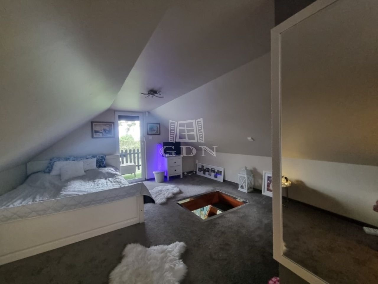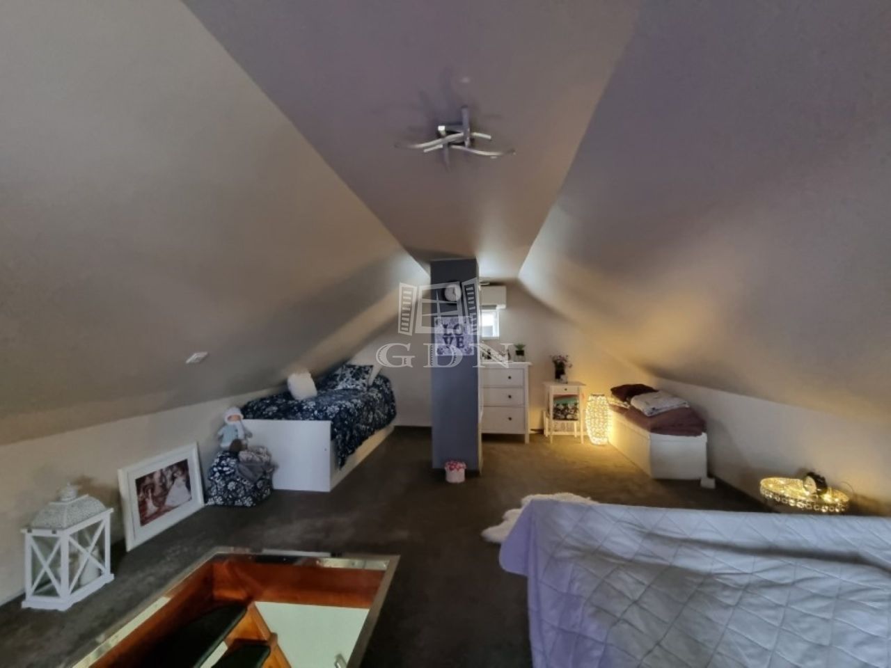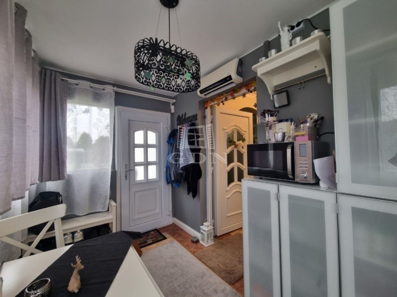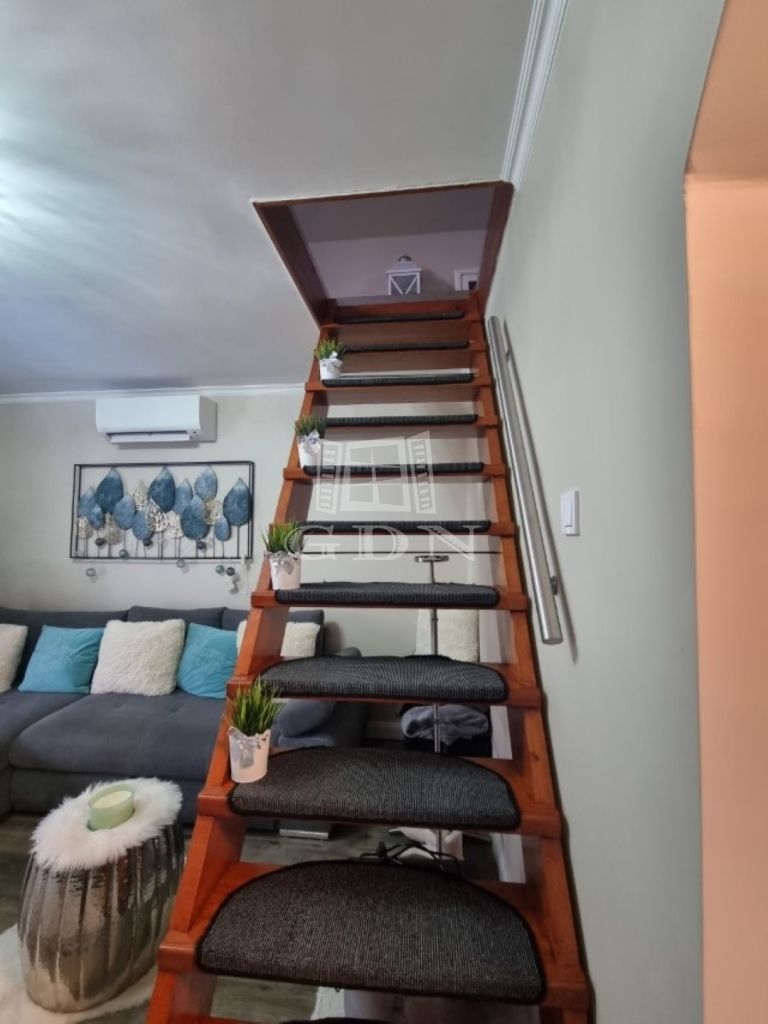 A földszinten egy előtér, egy gépesített konyha, fürdőszoba, tágas nappali lett kialakítva, a tetőtérben (kb. 15 m2) egy halószoba lett kialítva erkéllyel.