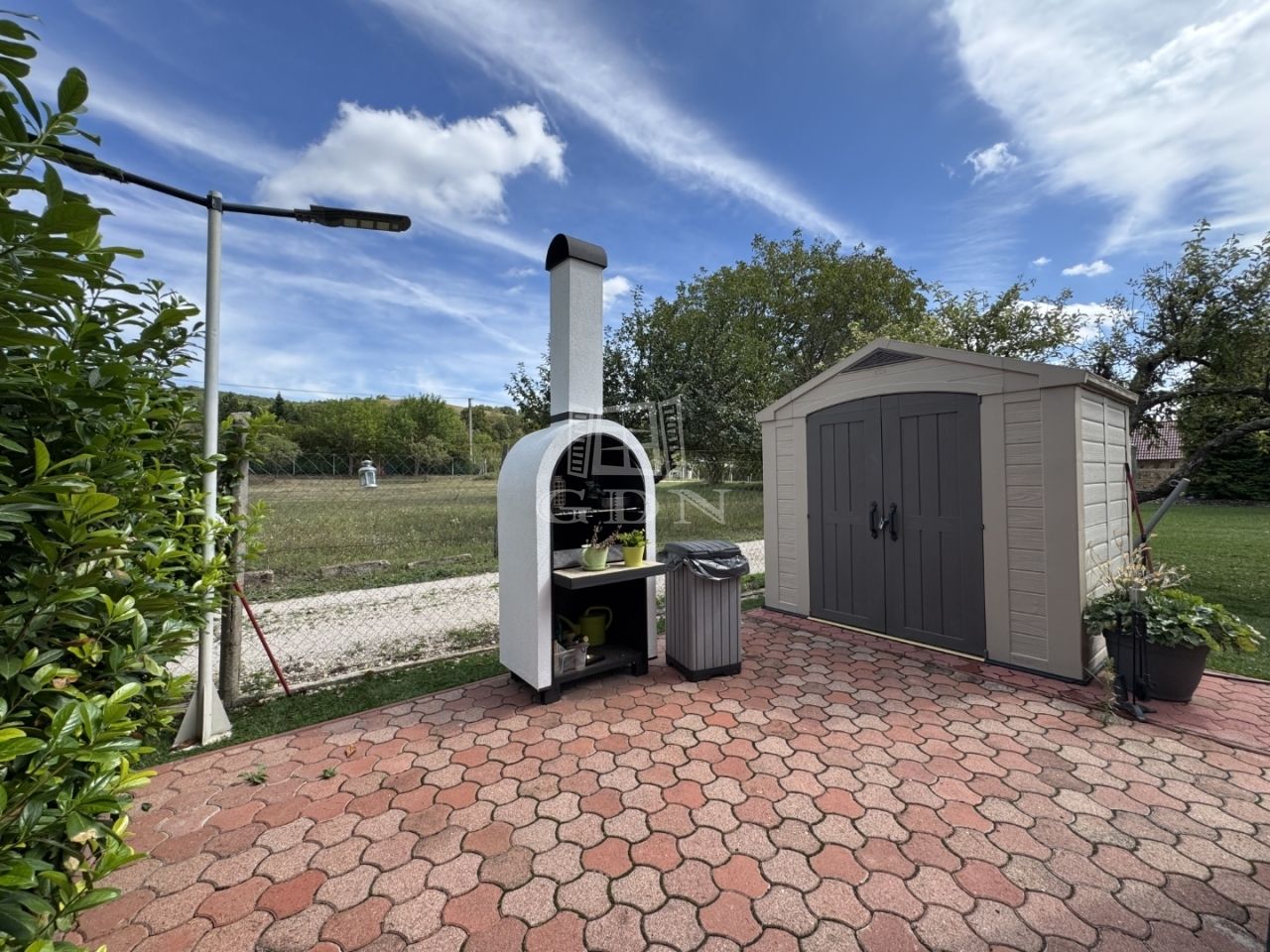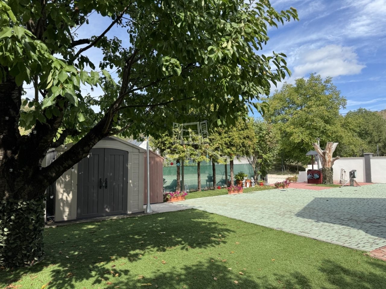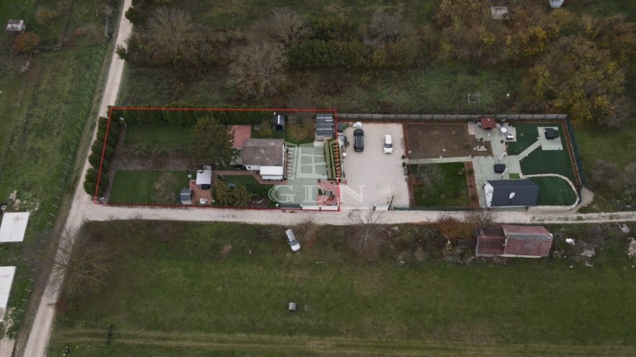 A telek teljesen körbekerített, parkosított, egy része műfűvel borított, több gyümölcsfa található rajta. A telken több,- tárolásra alkalmas melléképület van, melyből egy nyárikonyhává lett átalakítva. A telken található egy ásott kút is.