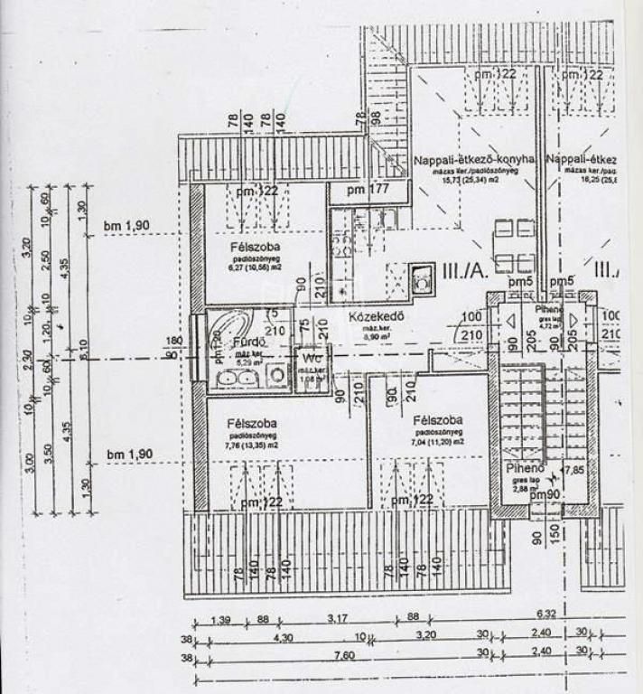 A lakás helyiségei: nappali-konyha-étkező: 15,73(25,34)m2, félszoba 6,27(10,85)m2, félszoba 7,76(13,35)m2, félszoba 7,04(11,20)m2, fürdőszoba 5,29m2, wc 1,08m2, közlekedő 8,90m2;