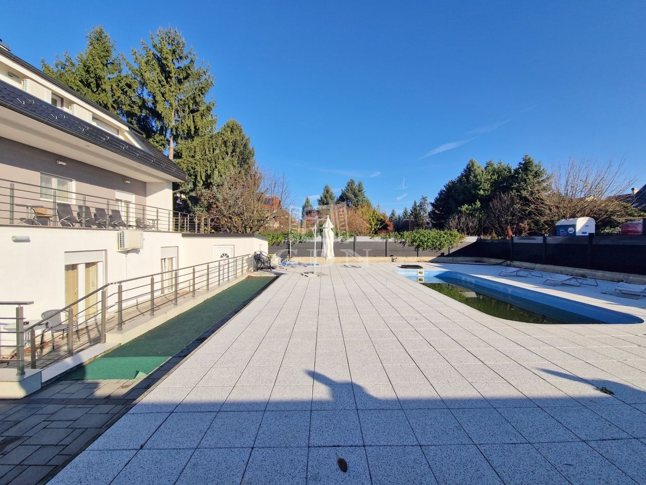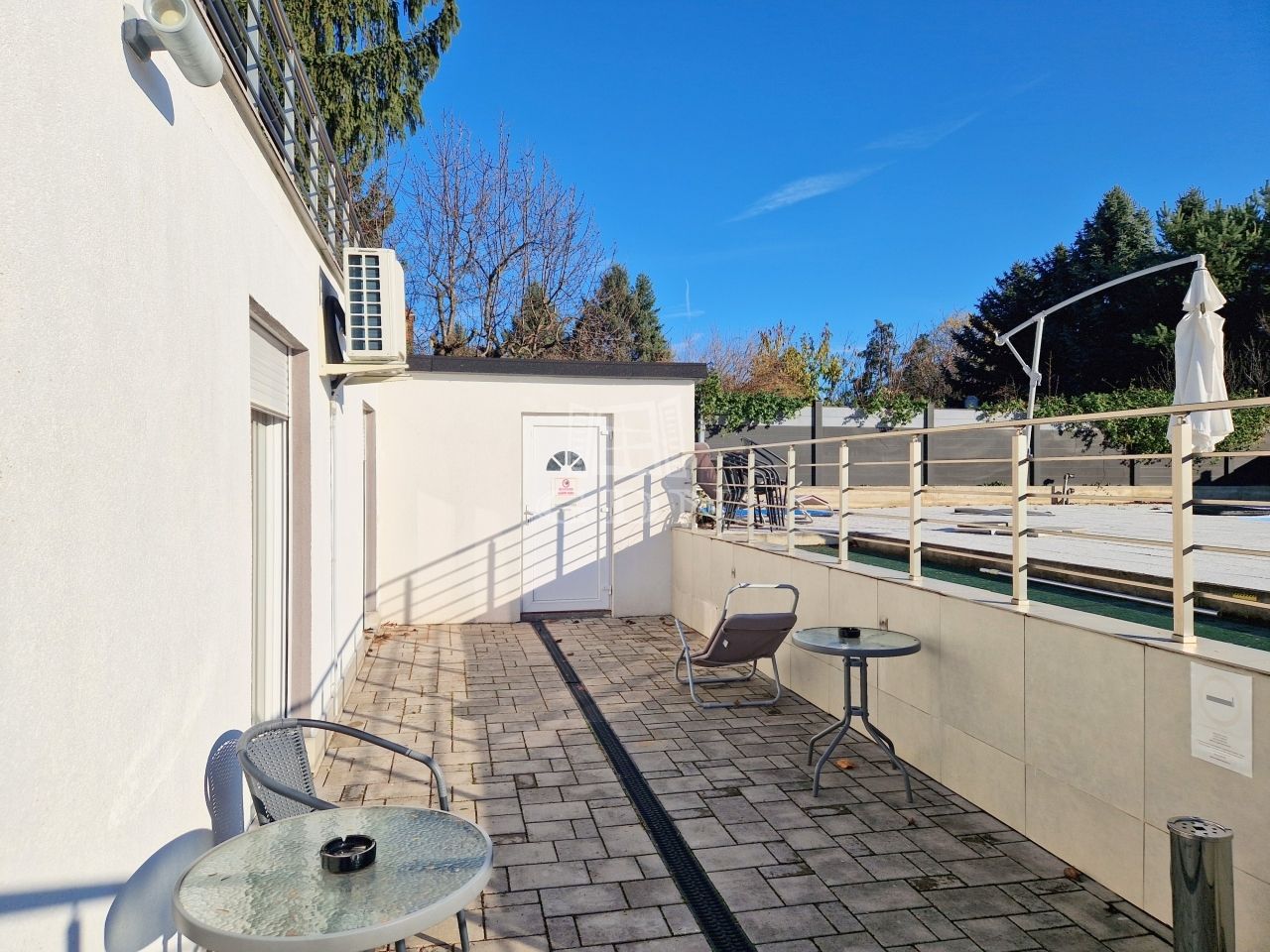 A 665 m2-es belátásmentesen körbekertelt területen található a medence, az azt kürül vevő napozó terasz valamint egy tárolásra alkalmas helyiség is.