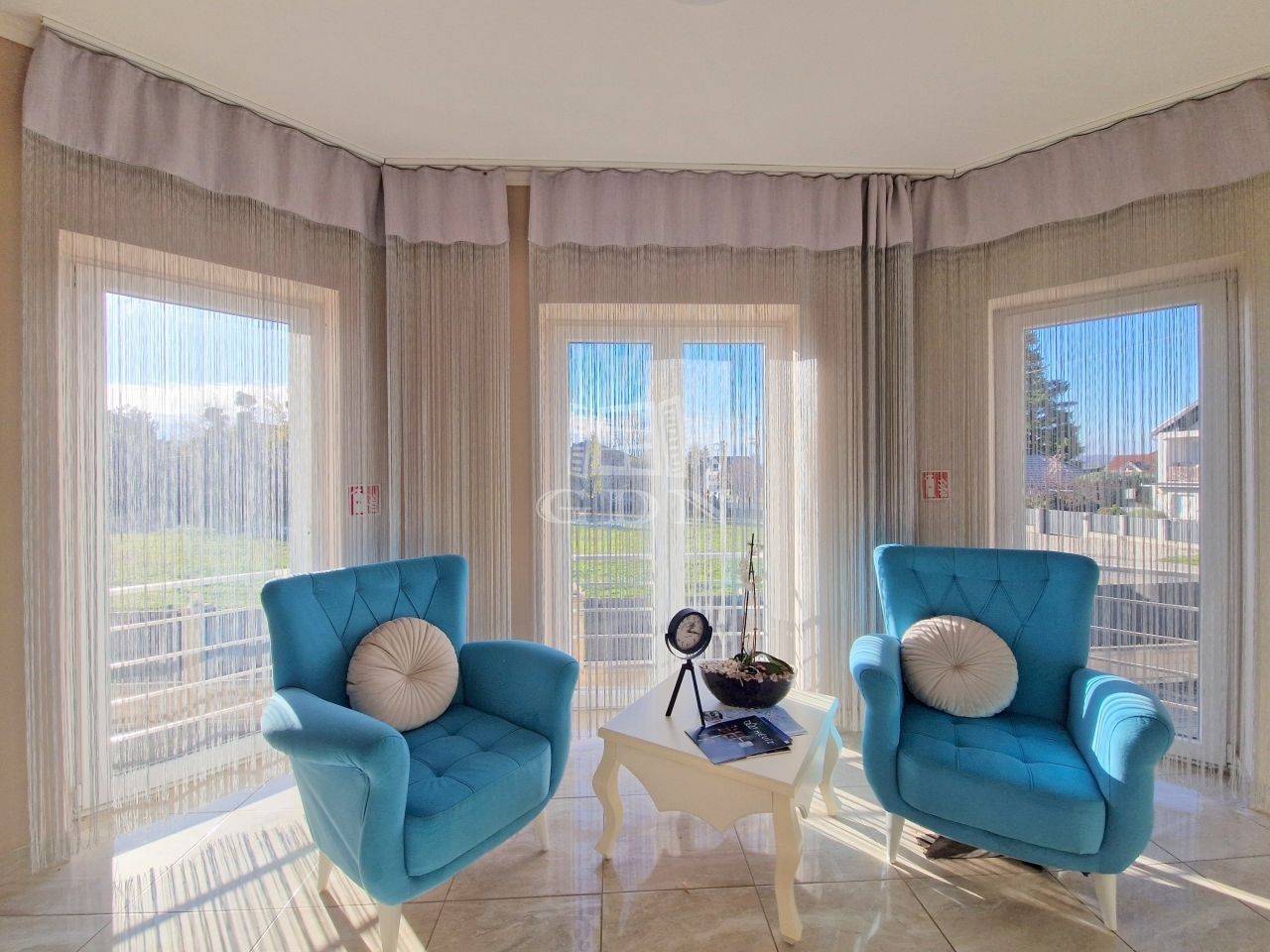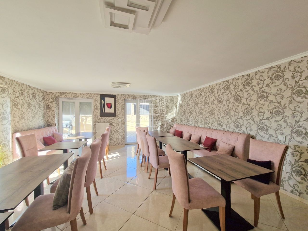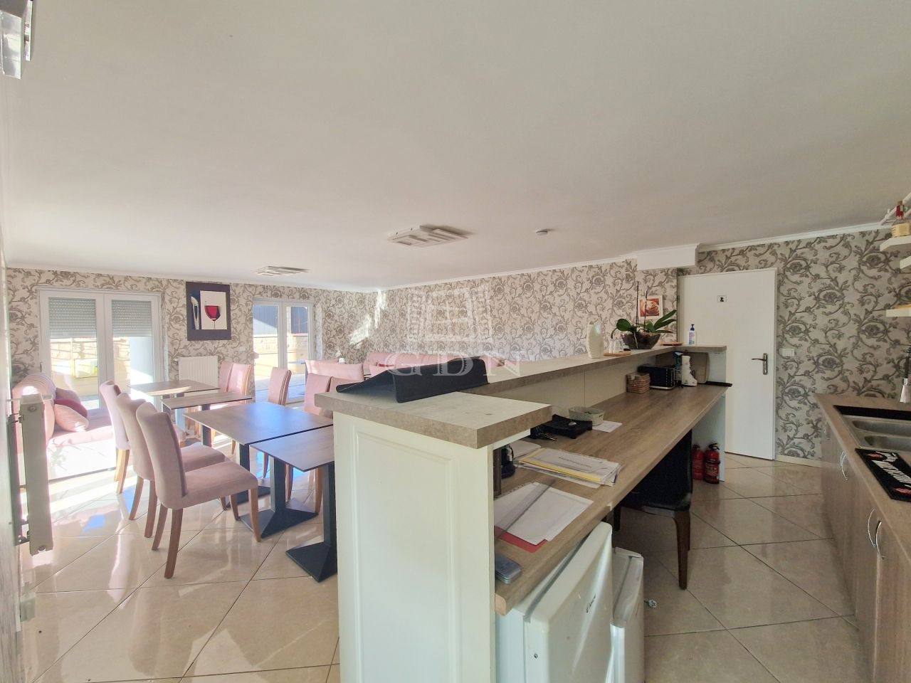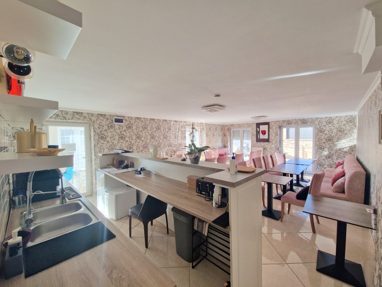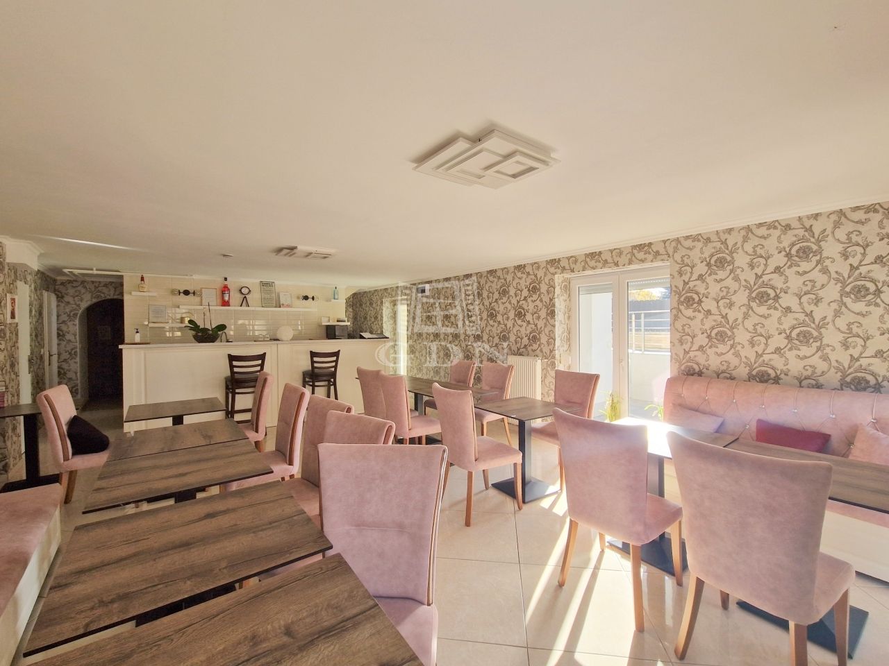 - A FÖLDSZINTEN: egy világos előtérnek, egy közel 50 m2-es, cca. 30 férőhelyes "reggeliztető" résznek, melyen óriás ablakfelületek találhatók, így a benapozottság mindig garantált.