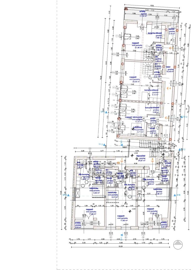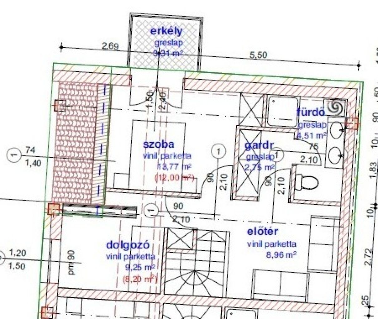 A projekt 5.-ös számú, első emeleti lakása 79,86 m2 lakóterületű, belső kétszintes kialakítású.