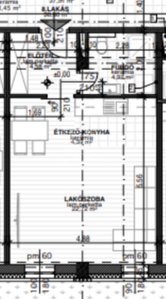 A lakás 36,60 nm, helyiségei:előtér 4,68 nm, fürdőszoba 4,92 nm, étkező/konyha 11,00 nm, nappali/lakószoba 18,10 nm.