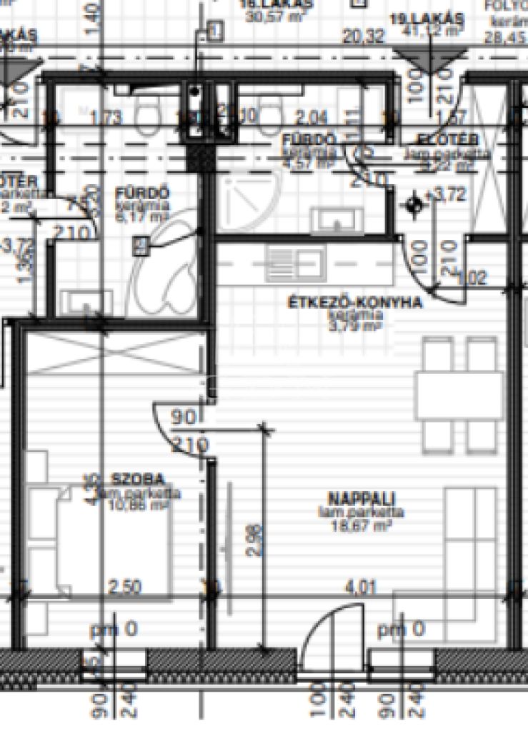 A lakás 41,12 nm, helyiségei:előtér 3,22 nm, fürdőszoba 4,52 nm, gardrób/szoba 10,84 nm, étkező/konyha 6,23 nm, nappali/lakószoba 16,24 nm.